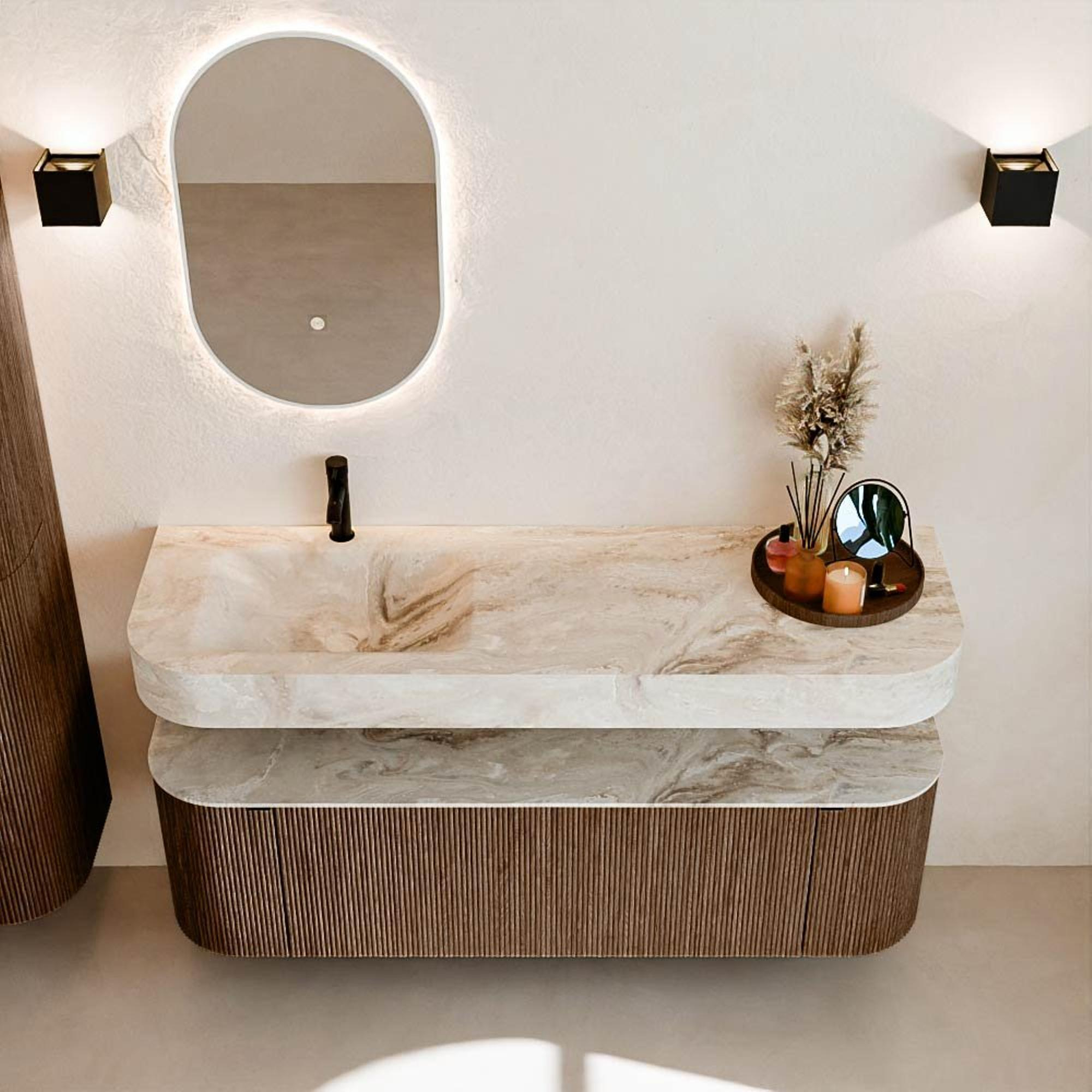 Matériaux naturels dans des tons chauds. Les nervures verticales apportent rythme et texture au design, tandis que le chêne confère une apparence chaleureuse et artisanale. Choisissez parmi 5 teintes de bois OAK, WALNUT, DUSK, SHADOW et RUBY, des couleurs de bois soigneusement sélectionnées pour enrichir les salles de bains modernes et classiques.