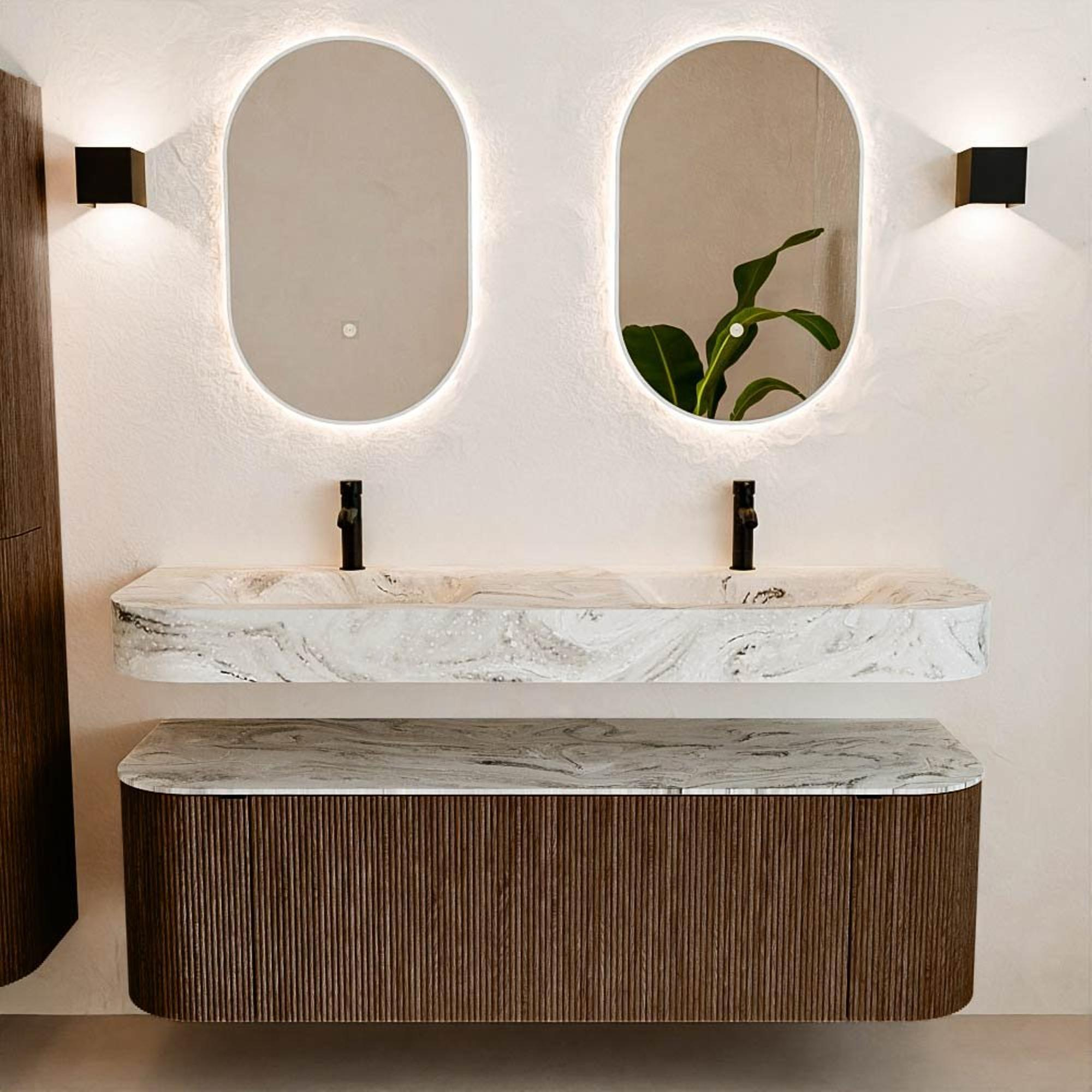 MONDIAZ THOR-DLUX Meuble de salle de bains 150cm arrondi gauche + droite couleur Walnut avec 1 tiroir et 2 portes. Vasque suspendue CLOUD Double 2 trous de robinet couleur Glace.