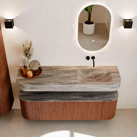 Matériaux naturels aux teintes chaudes. Les nervures verticales apportent rythme et texture au design, tandis que le chêne confère une apparence chaleureuse et artisanale. Choisissez parmi 5 teintes de bois OAK, WALNUT, DUSK, SHADOW et RUBY, des couleurs de bois soigneusement sélectionnées pour enrichir les salles de bains modernes et classiques.