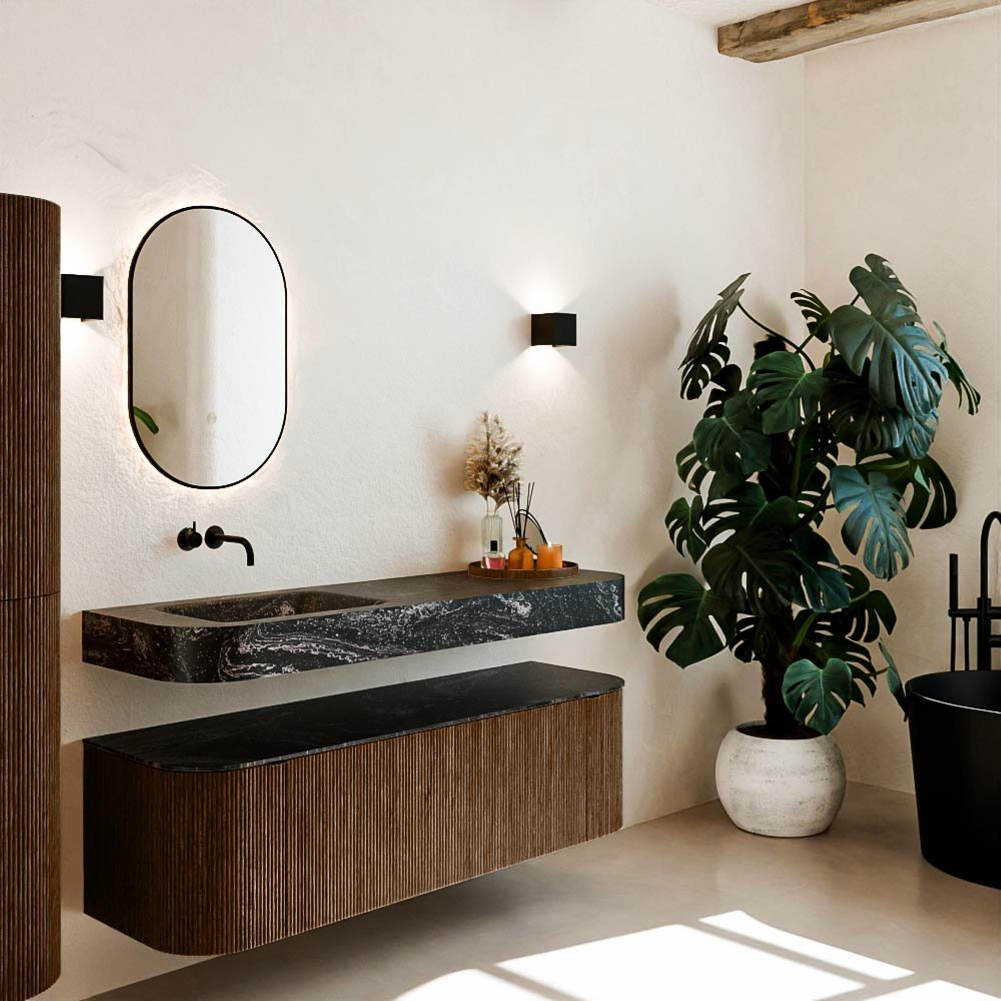 Matériaux naturels dans des tons chauds. Les nervures verticales apportent rythme et texture au design, tandis que le chêne confère une apparence chaleureuse et artisanale. Choisissez parmi 5 teintes de bois OAK, WALNUT, DUSK, SHADOW et RUBY, des couleurs de bois soigneusement sélectionnées pour enrichir les salles de bains modernes et classiques.