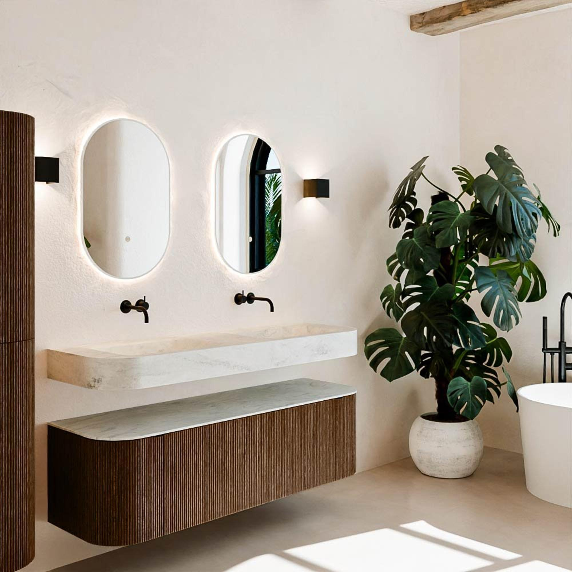 Matériaux naturels dans des tons chauds. Les nervures verticales apportent rythme et texture au design, tandis que le chêne confère une apparence chaleureuse et artisanale. Choisissez parmi 5 teintes de bois OAK, WALNUT, DUSK, SHADOW et RUBY, des couleurs de bois soigneusement sélectionnées pour enrichir les salles de bains modernes et classiques.