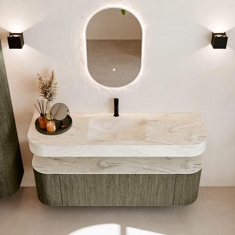 Matériaux naturels dans des tons chauds. Les côtes verticales apportent rythme et texture au design, tandis que le chêne confère une apparence chaleureuse et artisanale. Choisissez parmi 5 teintes de bois OAK, WALNUT, DUSK, SHADOW et RUBY, des couleurs de bois soigneusement sélectionnées pour enrichir les salles de bains modernes et classiques.