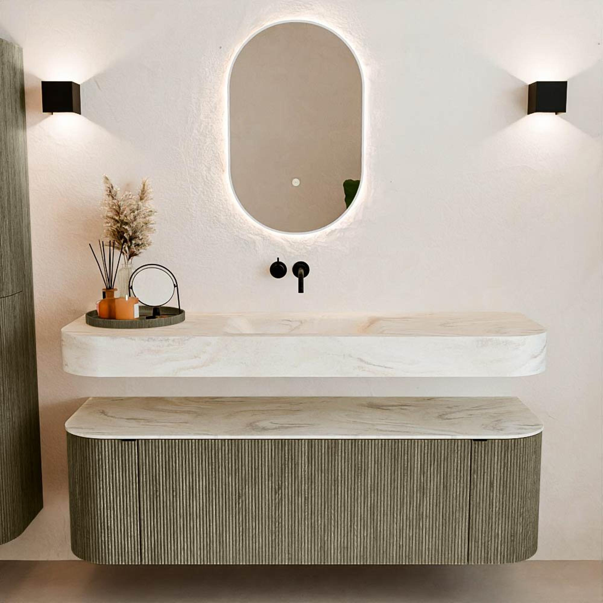 Matériaux naturels dans des tons chauds. Les nervures verticales apportent rythme et texture au design, tandis que le chêne confère une apparence chaleureuse et artisanale. Choisissez parmi 5 teintes de bois OAK, WALNUT, DUSK, SHADOW et RUBY, des couleurs de bois soigneusement sélectionnées pour enrichir les salles de bains modernes et classiques.