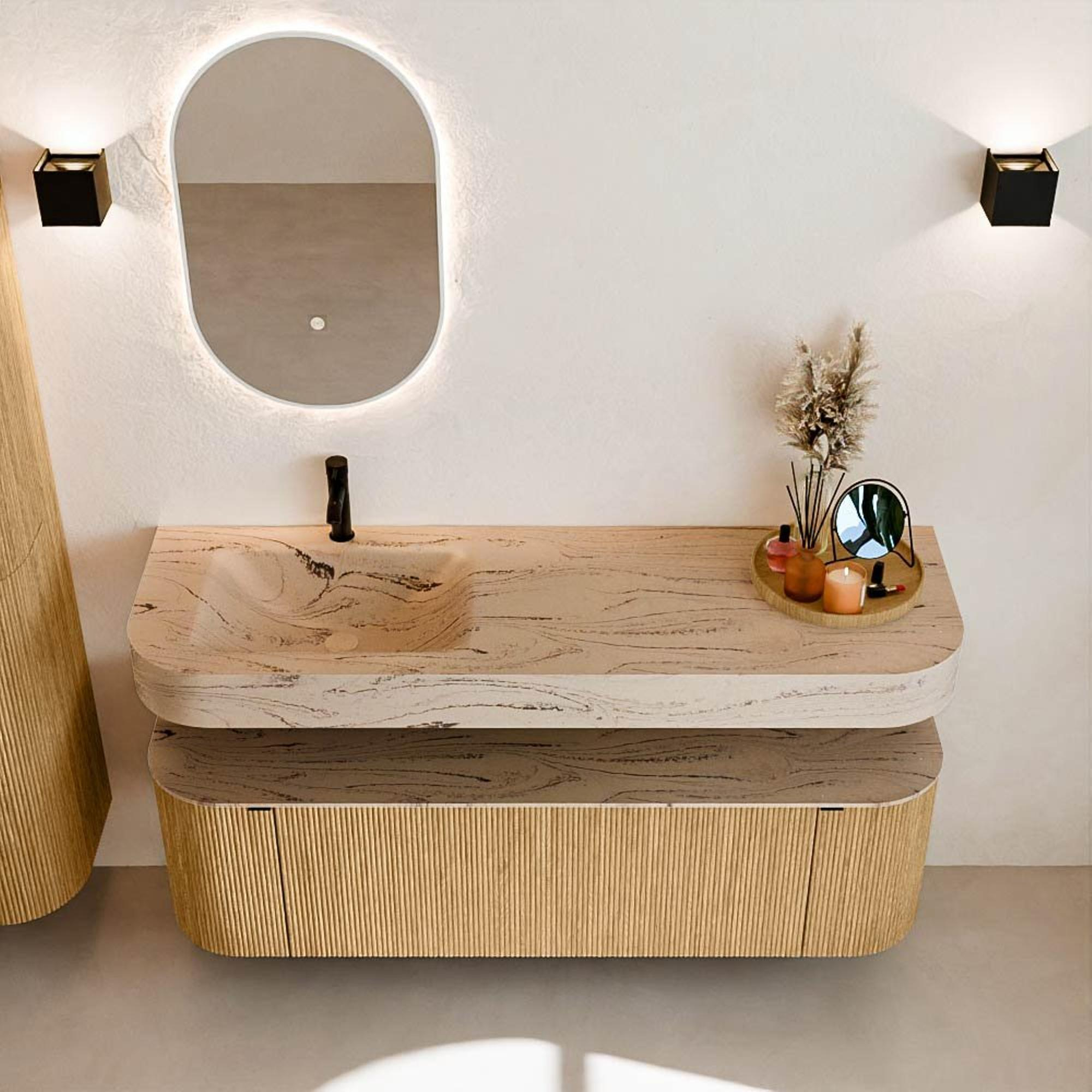 MONDIAZ THOR-DLUX Meuble de salle de bains - 150cm - arrondi gauche + droite - couleur Oak - 1 tiroir - 2 portes - Vasque suspendue CLOUD Gauche 1 trou de robinet couleur Arena