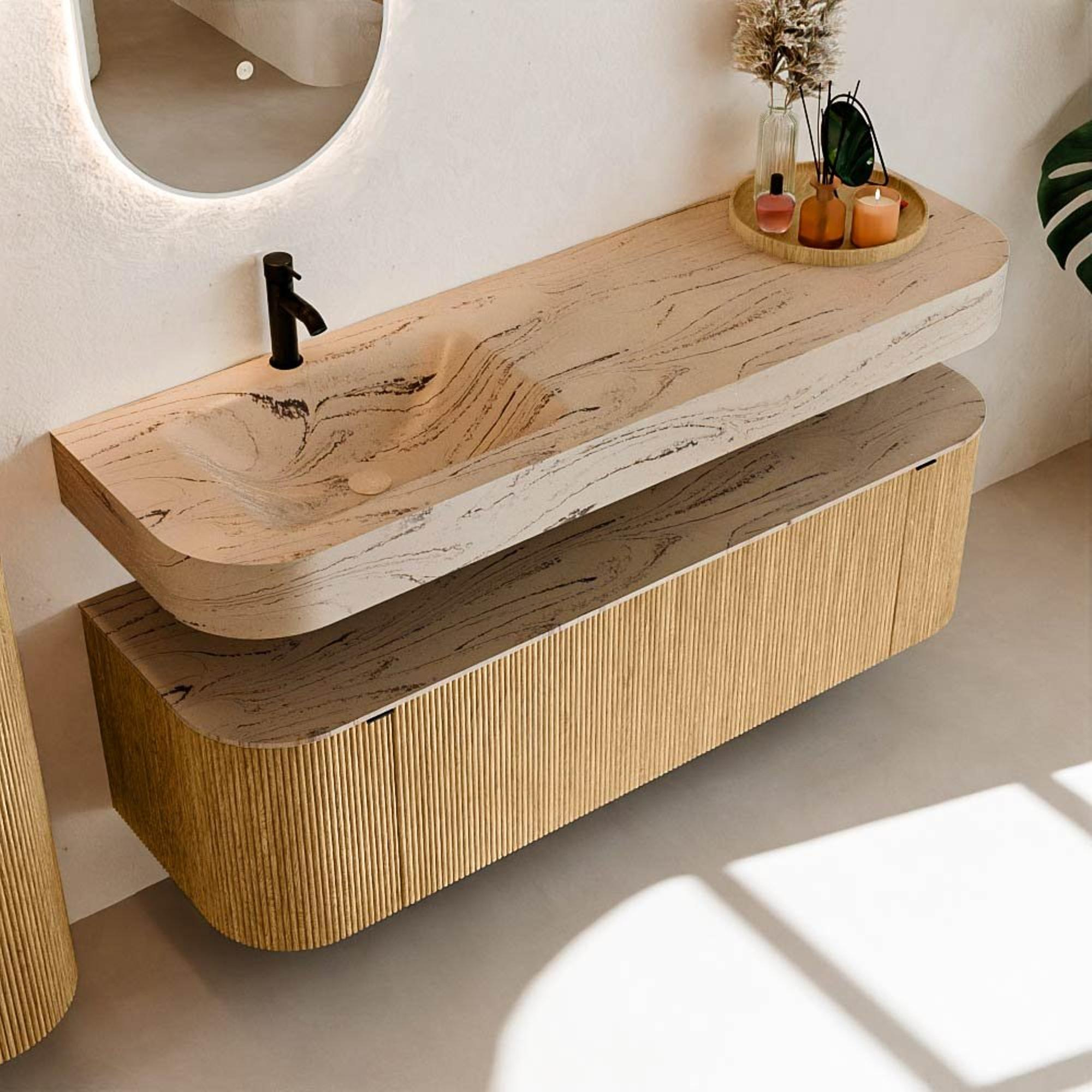 Matériaux naturels aux teintes chaudes. Les nervures verticales apportent rythme et texture au design, tandis que le chêne confère une apparence chaleureuse et artisanale. Choisissez parmi 5 teintes de bois OAK, WALNUT, DUSK, SHADOW et RUBY, des couleurs de bois soigneusement sélectionnées pour enrichir les salles de bains modernes et classiques.