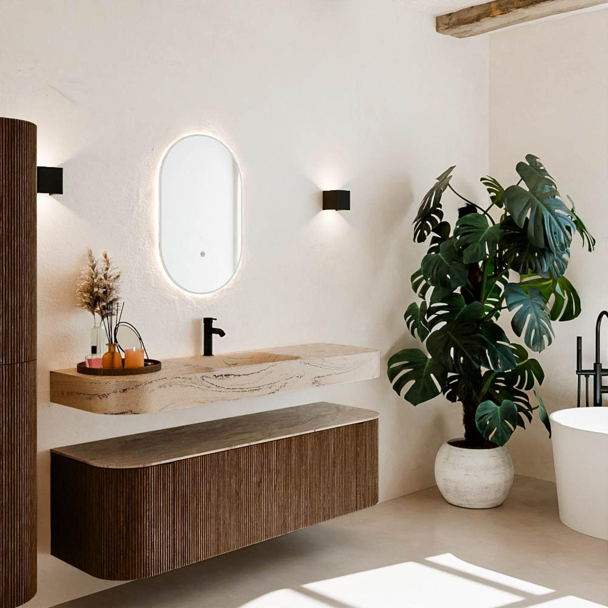 Matériaux naturels dans des tons chauds. Les nervures verticales apportent rythme et texture au design, tandis que le chêne confère une apparence chaleureuse et artisanale. Choisissez parmi 5 teintes de bois OAK, WALNUT, DUSK, SHADOW et RUBY, des couleurs de bois soigneusement sélectionnées pour enrichir les salles de bains modernes et classiques.