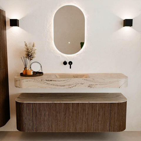 Matériaux naturels dans des tons chauds. Les nervures verticales apportent rythme et texture au design, tandis que le chêne confère une apparence chaleureuse et artisanale. Choisissez parmi 5 teintes de bois OAK, WALNUT, DUSK, SHADOW et RUBY, des couleurs de bois soigneusement sélectionnées pour enrichir les salles de bains modernes et classiques.