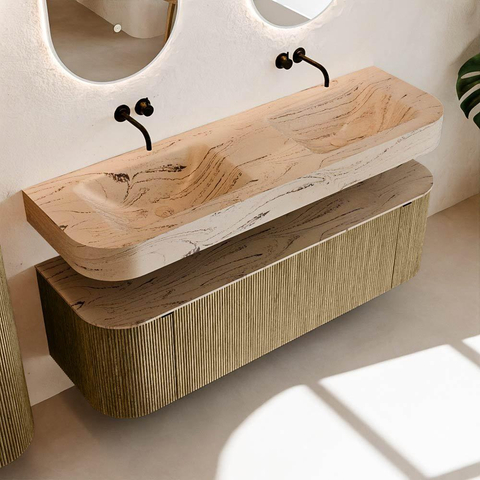 Matériaux naturels dans des tons chauds. Les nervures verticales apportent rythme et texture au design, tandis que le chêne offre une apparence chaleureuse et artisanale. Choisissez parmi 5 teintes de bois OAK, WALNUT, DUSK, SHADOW et RUBY, des couleurs de bois soigneusement sélectionnées pour enrichir les salles de bains modernes et classiques.