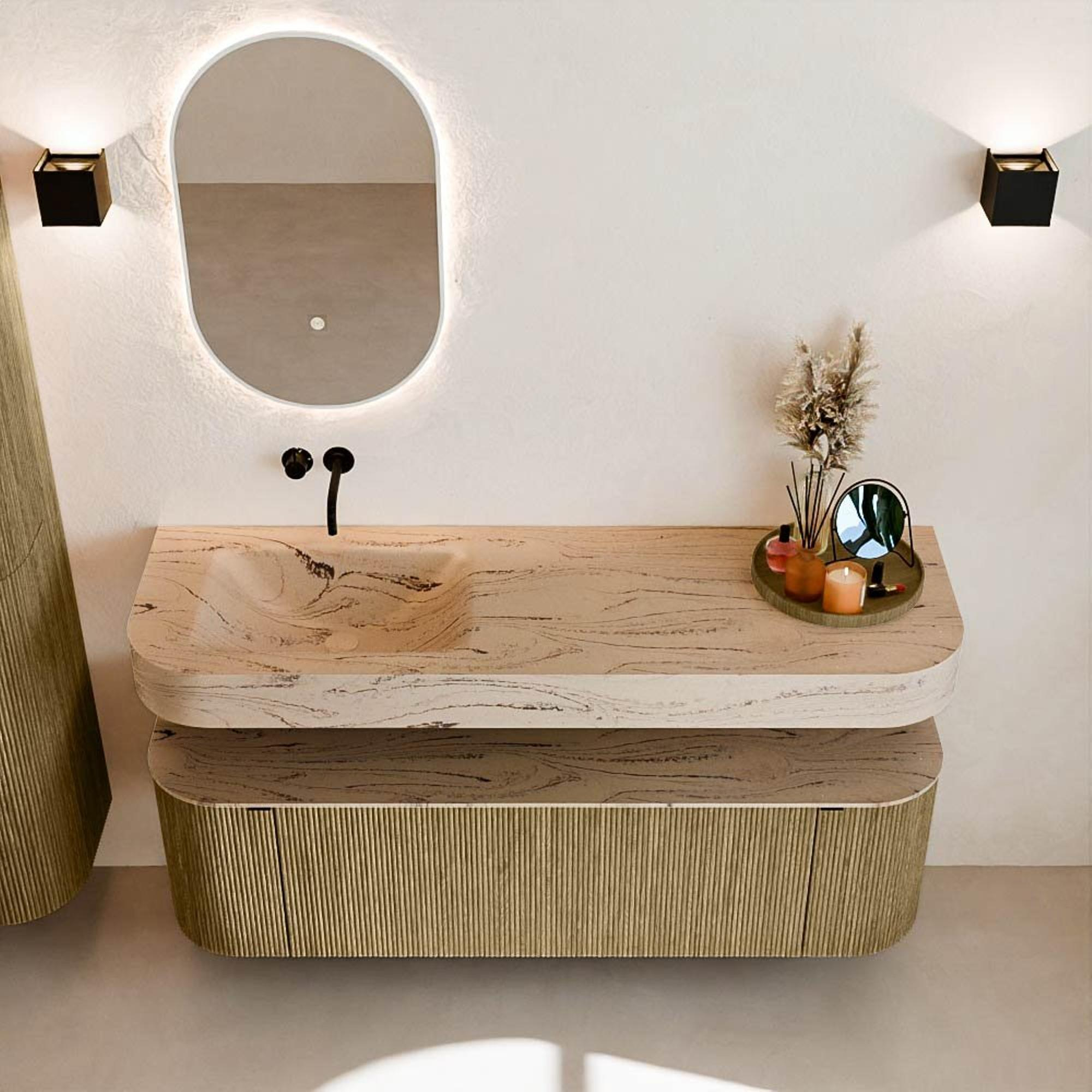 Au-dessus du meuble flotte une vasque suspendue assortie aux coins arrondis – parfaitement adaptée à la forme du meuble. La vasque est en Solid Surface et suit subtilement les lignes du meuble inférieur, créant un ensemble harmonieux. Le plan de travail en Solid Surface constitue une base solide et facile d'entretien et complète la combinaison.