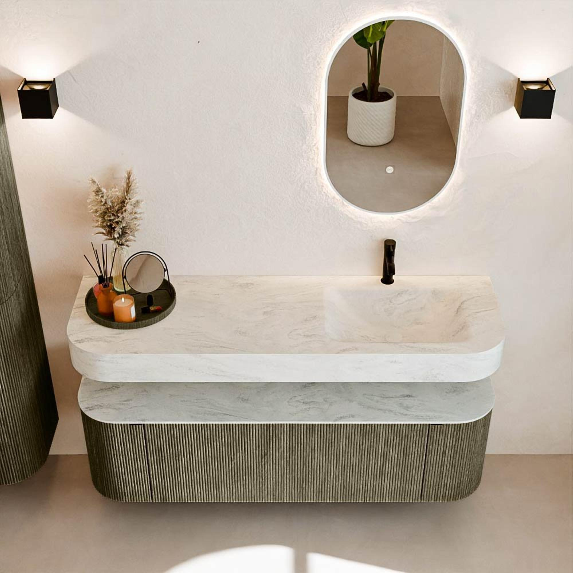 Au-dessus du meuble flotte une vasque suspendue assortie aux coins arrondis – parfaitement adaptée à la forme du meuble. La vasque est réalisée en Solid Surface et suit subtilement les lignes du meuble inférieur, créant ainsi un ensemble harmonieux. Le plan de travail en Solid Surface forme une base solide, facile d'entretien, et complète la combinaison.