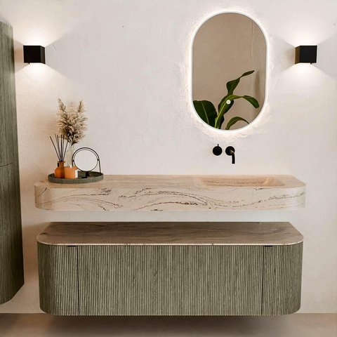 Matériaux naturels dans des tons chauds. Les nervures verticales apportent rythme et texture au design, tandis que le chêne confère une apparence chaleureuse et artisanale. Choisissez parmi 5 teintes de bois OAK, WALNUT, DUSK, SHADOW et RUBY, des couleurs de bois soigneusement sélectionnées pour enrichir les salles de bains modernes et classiques.