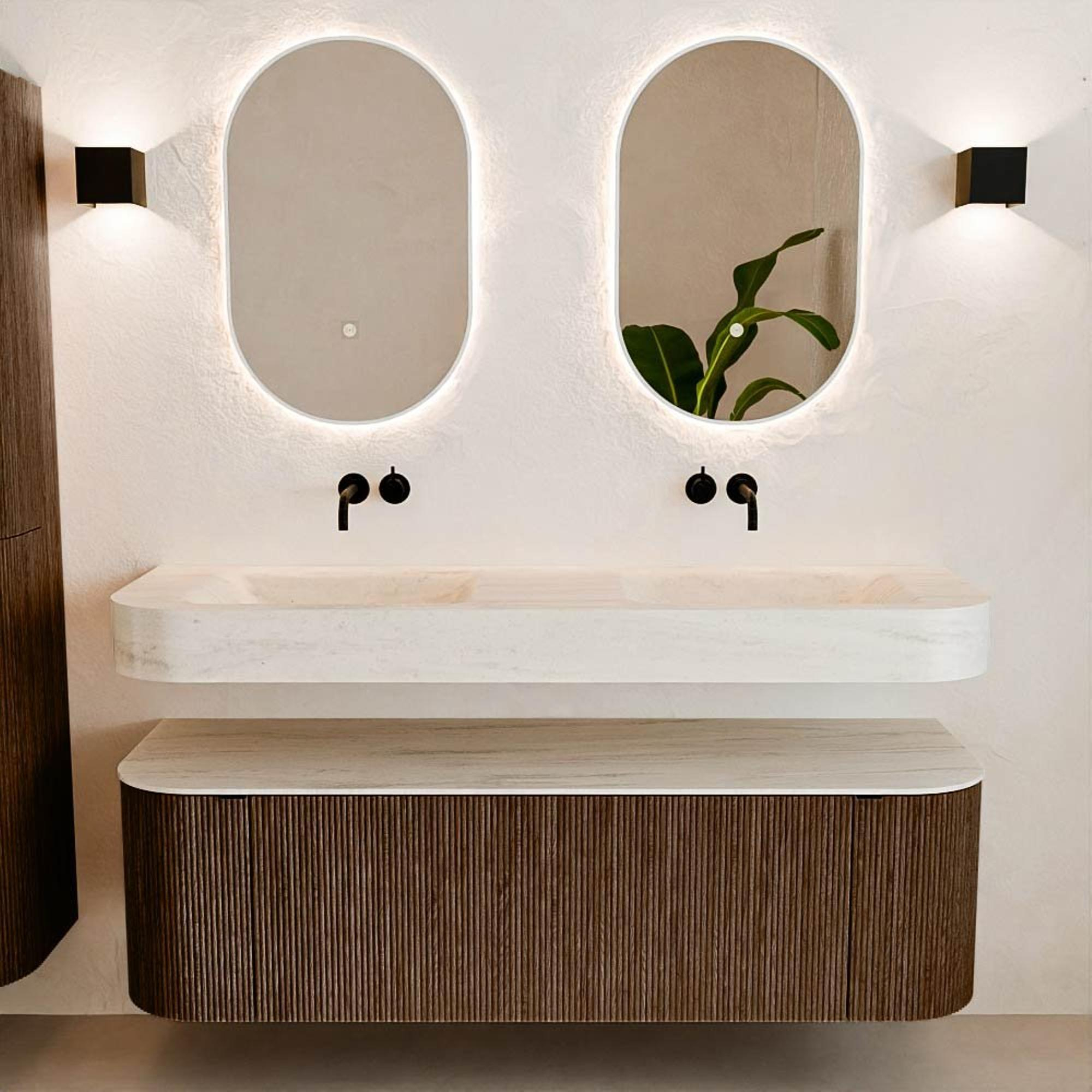 Matériaux naturels dans des tons chauds. Les nervures verticales apportent rythme et texture au design, tandis que le chêne confère une apparence chaleureuse et artisanale. Choisissez parmi 5 teintes de bois OAK, WALNUT, DUSK, SHADOW et RUBY, des couleurs de bois soigneusement sélectionnées pour enrichir les salles de bains modernes et classiques.