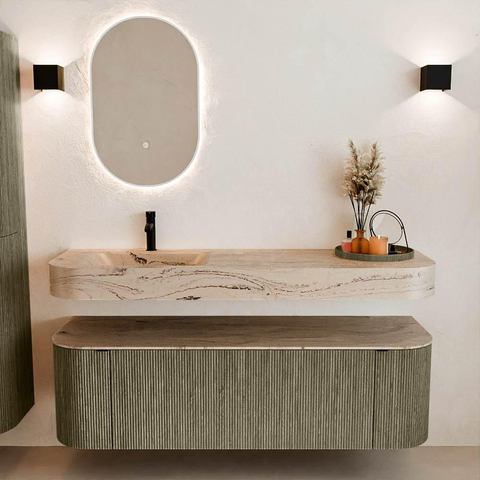 Matériaux naturels dans des tons chauds. Les nervures verticales apportent rythme et texture au design, tandis que le chêne confère une apparence chaleureuse et artisanale. Choisissez parmi 5 teintes de bois OAK, WALNUT, DUSK, SHADOW et RUBY, des couleurs de bois soigneusement sélectionnées pour enrichir les salles de bains modernes et classiques.