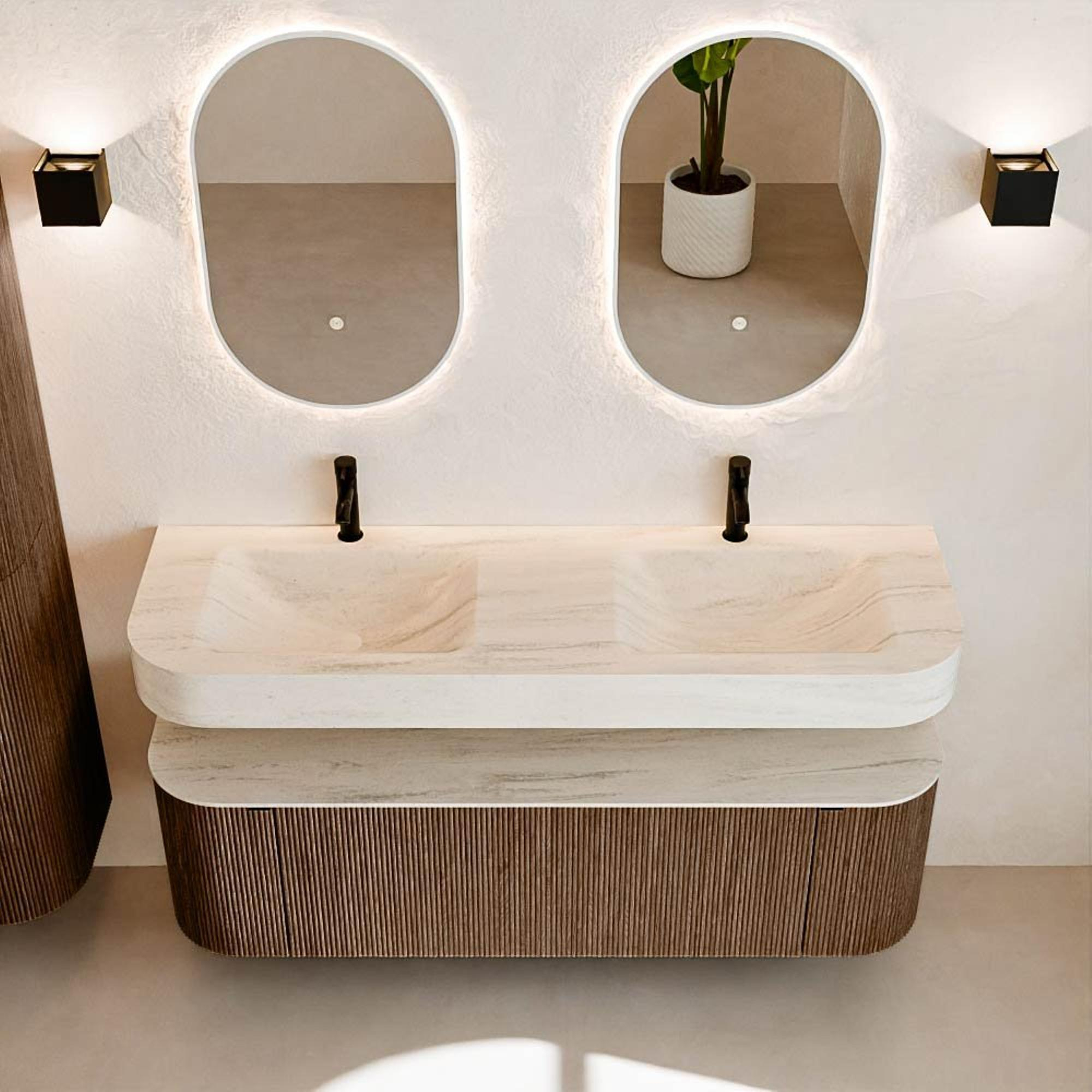 MONDIAZ THOR-DLUX 150cm meuble de salle de bains arrondi gauche + droite couleur Walnut avec 1 tiroir et 2 portes. Vasque suspendue CLOUD Double 2 trous de robinet couleur Meli.