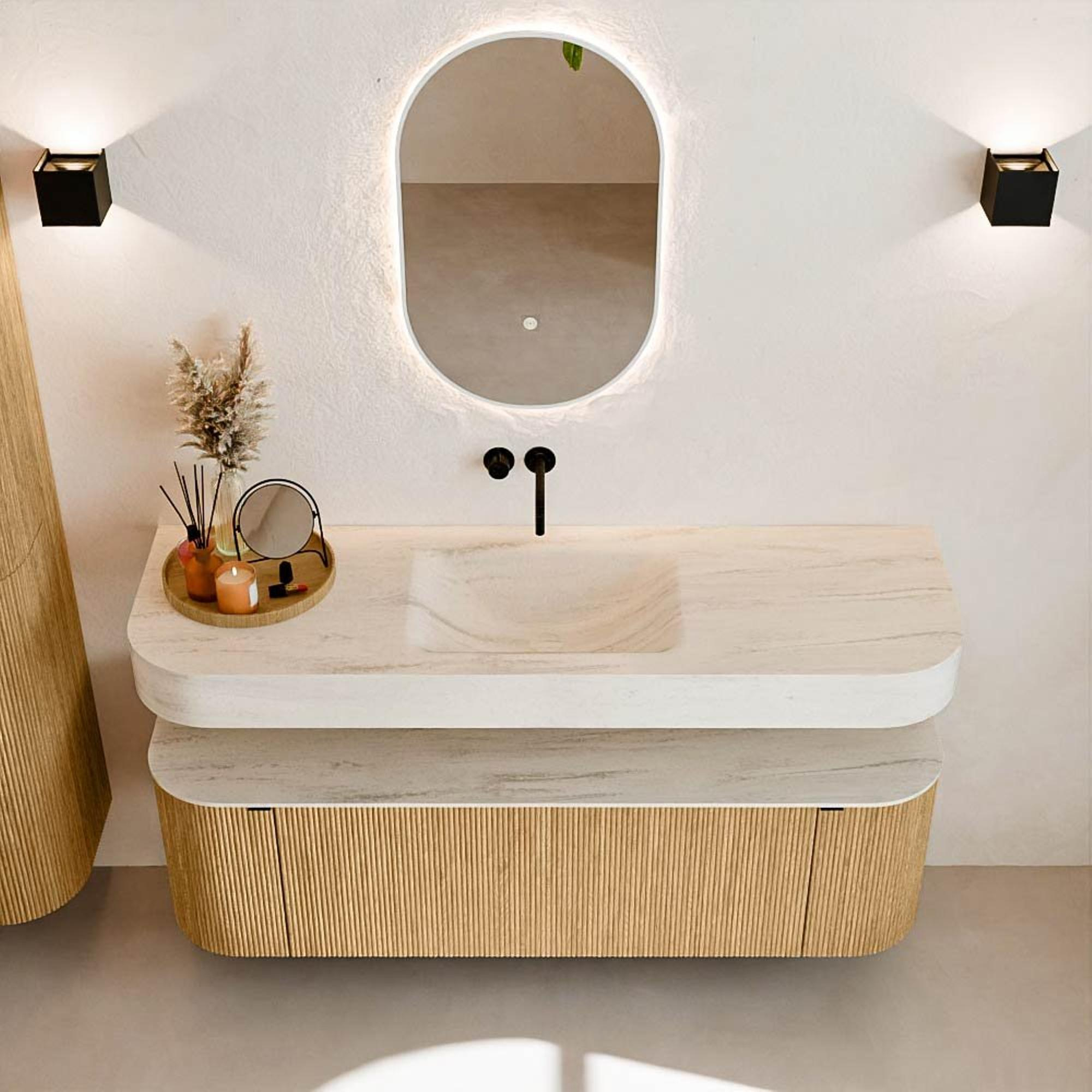 Au-dessus du meuble flotte une vasque suspendue assortie aux coins arrondis – parfaitement adaptée à la forme du meuble. La vasque est en Solid Surface et suit subtilement les lignes du meuble inférieur, créant ainsi un ensemble harmonieux. Le plan de travail en Solid Surface constitue une base solide et facile d'entretien, complétant la combinaison.