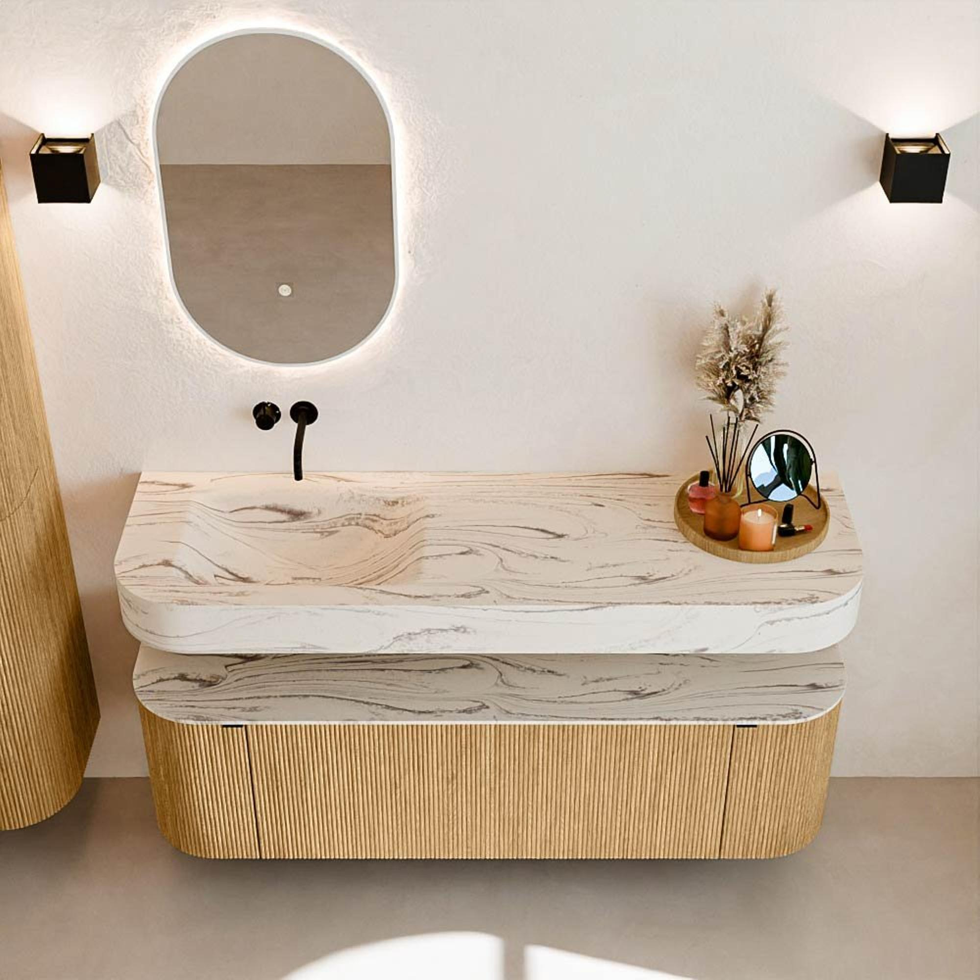 MONDIAZ THOR-DLUX 150cm meuble de salle de bains arrondi gauche + droite couleur Oak avec 1 tiroir et 2 portes. Vasque suspendue CLOUD Gauche sans trou de robinet couleur Nata.