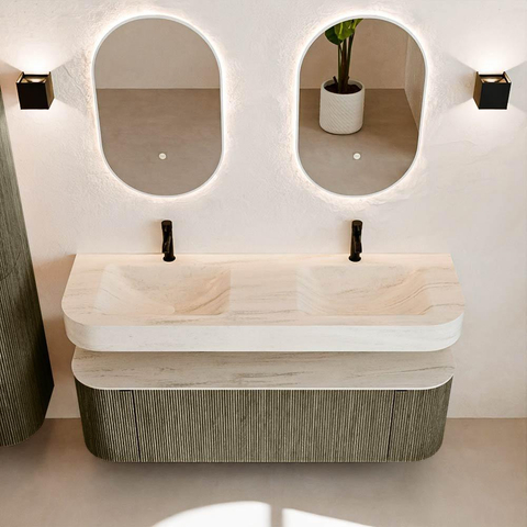 Matériaux naturels dans des tons chauds. Les nervures verticales apportent rythme et texture au design, tandis que le chêne confère une apparence chaleureuse et artisanale. Choisissez parmi 5 teintes de bois OAK, WALNUT, DUSK, SHADOW et RUBY, des couleurs de bois soigneusement sélectionnées pour enrichir les salles de bains modernes et classiques.
