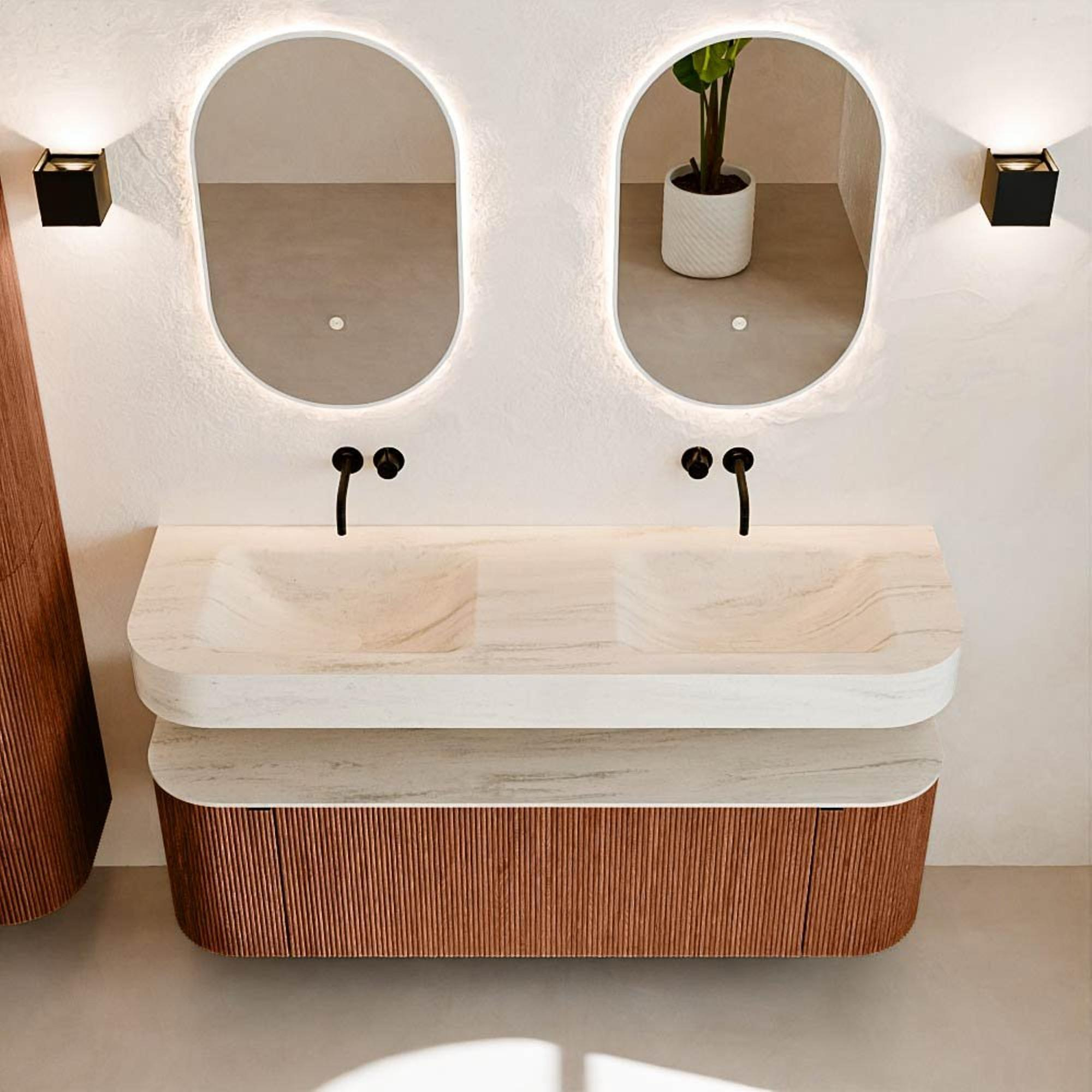 Matériaux naturels dans des tons chauds. Les nervures verticales apportent rythme et texture au design, tandis que le chêne confère une apparence chaleureuse et artisanale. Choisissez parmi 5 teintes de bois OAK, WALNUT, DUSK, SHADOW et RUBY, des couleurs de bois soigneusement sélectionnées pour enrichir les salles de bains modernes et classiques.