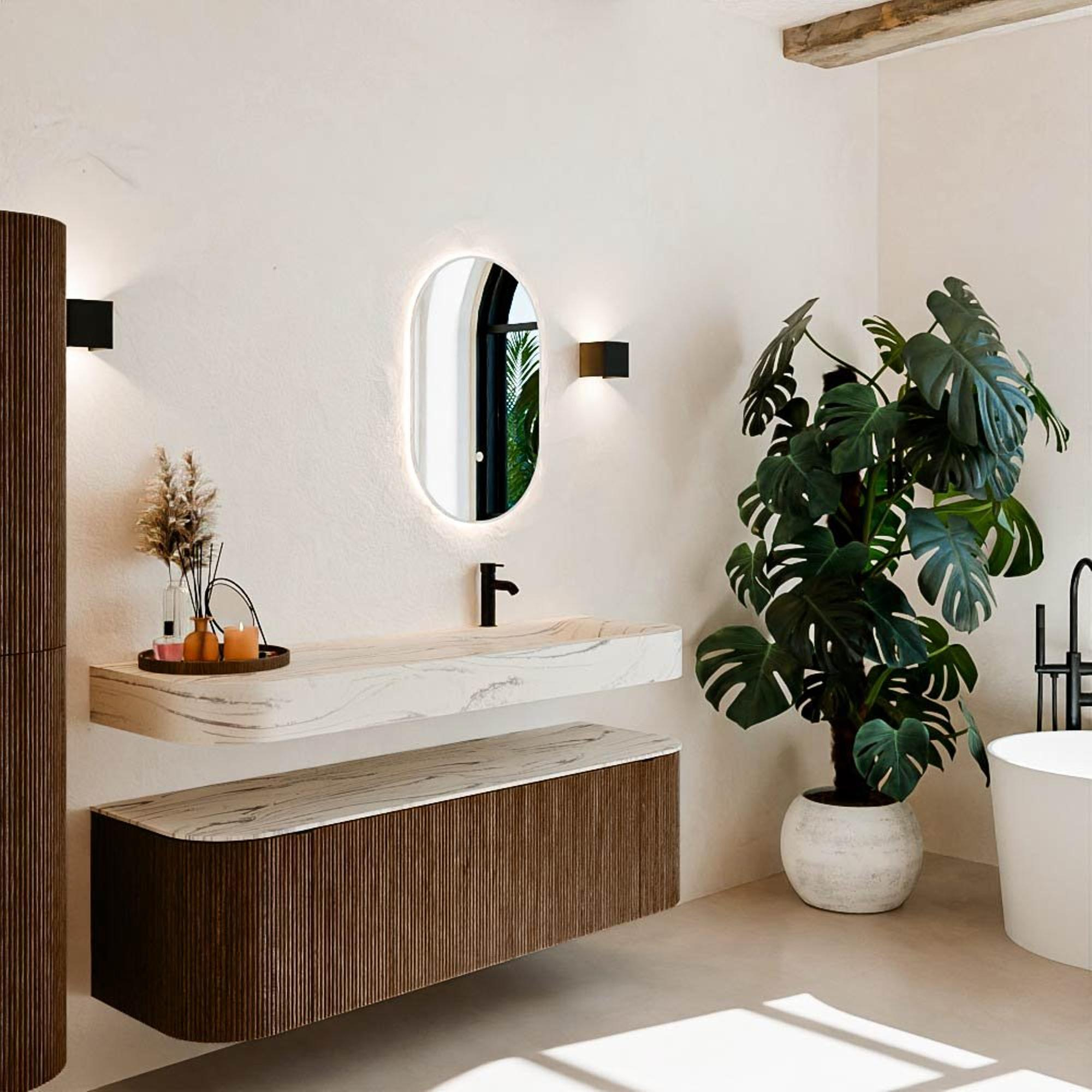 Matériaux naturels dans des tons chauds. Les cannelures verticales apportent rythme et texture au design, tandis que le chêne confère une apparence chaleureuse et artisanale. Choisissez parmi 5 teintes de bois OAK, WALNUT, DUSK, SHADOW et RUBY, des couleurs de bois soigneusement sélectionnées pour enrichir les salles de bains modernes et classiques.