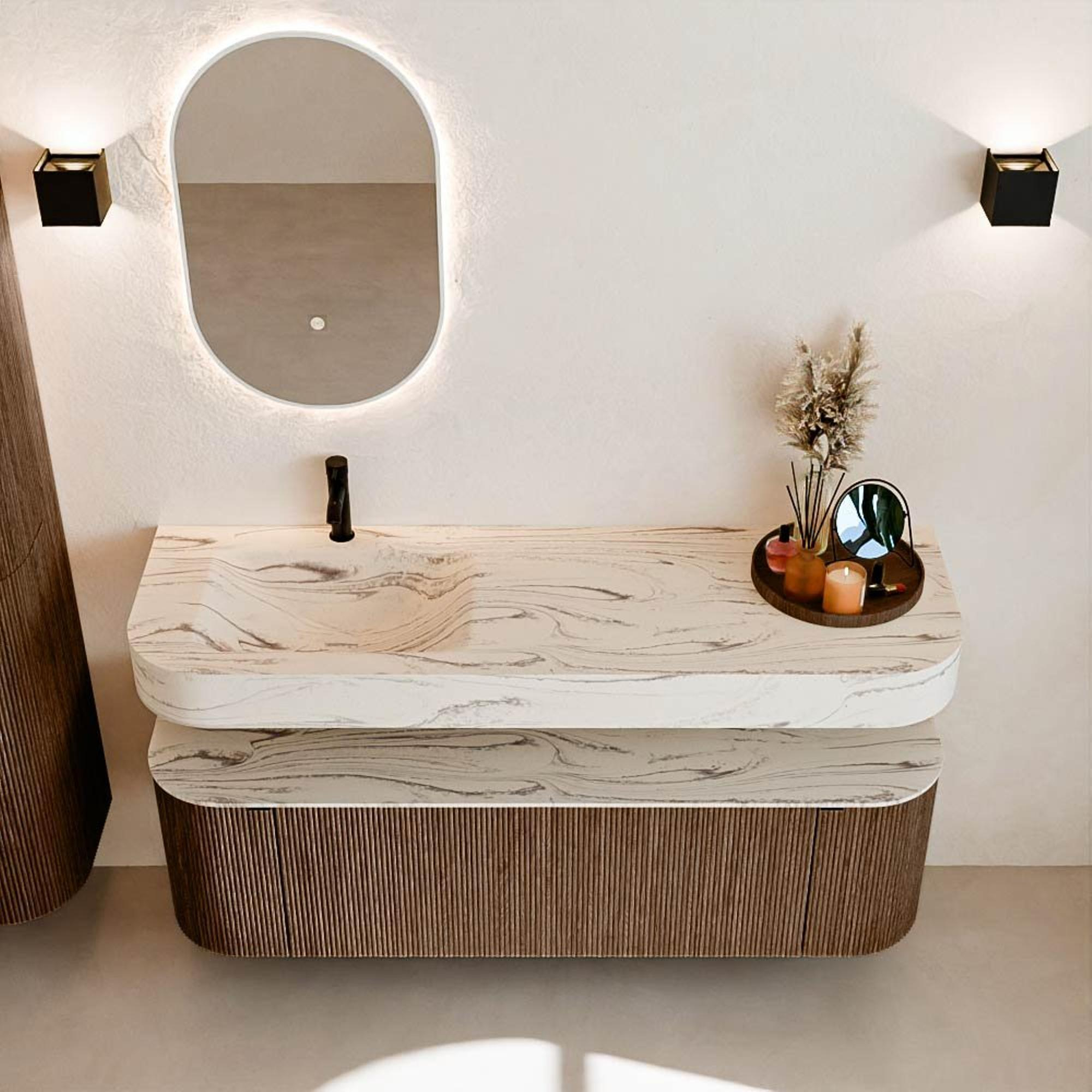 Au-dessus du meuble flotte une vasque suspendue assortie aux coins arrondis – parfaitement adaptée à la forme du meuble. La vasque est réalisée en Solid Surface et suit subtilement les lignes du meuble inférieur, créant ainsi un ensemble harmonieux. Le plan de travail en Solid Surface forme une base solide, facile d'entretien, et complète la combinaison.