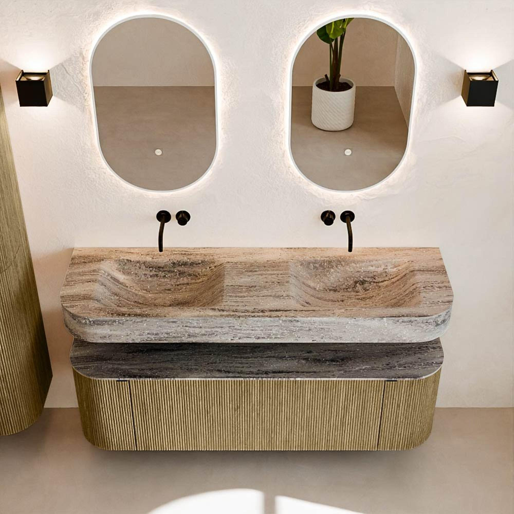 Matériaux naturels dans des tons chauds. Les reliefs verticaux apportent rythme et texture au design, tandis que le chêne confère une apparence chaleureuse et artisanale. Choisissez parmi 5 teintes de bois OAK, WALNUT, DUSK, SHADOW et RUBY, des couleurs de bois soigneusement sélectionnées pour enrichir les salles de bains modernes et classiques.
