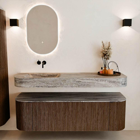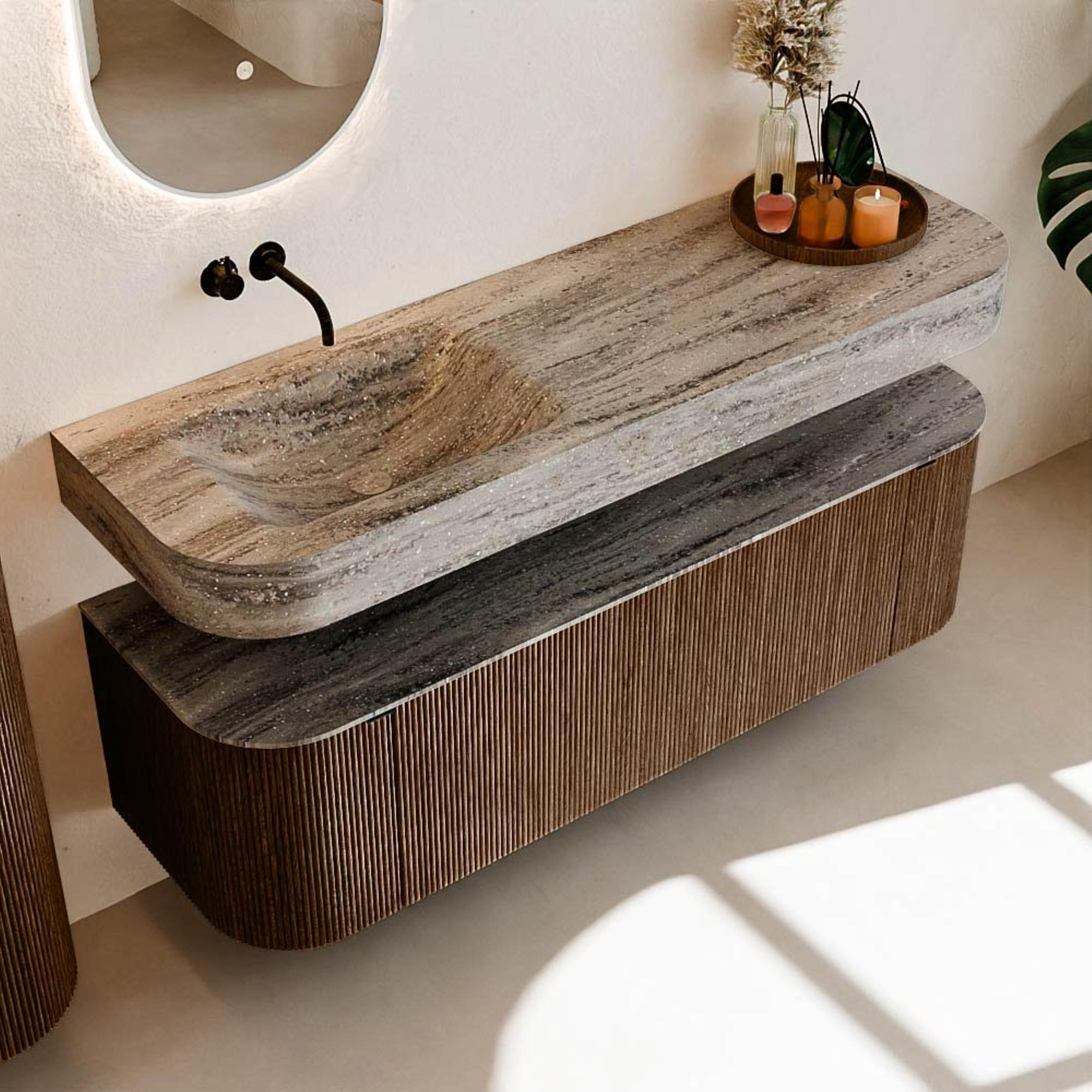 Matériaux naturels dans des tons chauds. Les nervures verticales apportent rythme et texture au design, tandis que le chêne confère une apparence chaleureuse et artisanale. Choisissez parmi 5 teintes de bois OAK, WALNUT, DUSK, SHADOW et RUBY, des couleurs de bois soigneusement sélectionnées pour enrichir les salles de bains modernes et classiques.