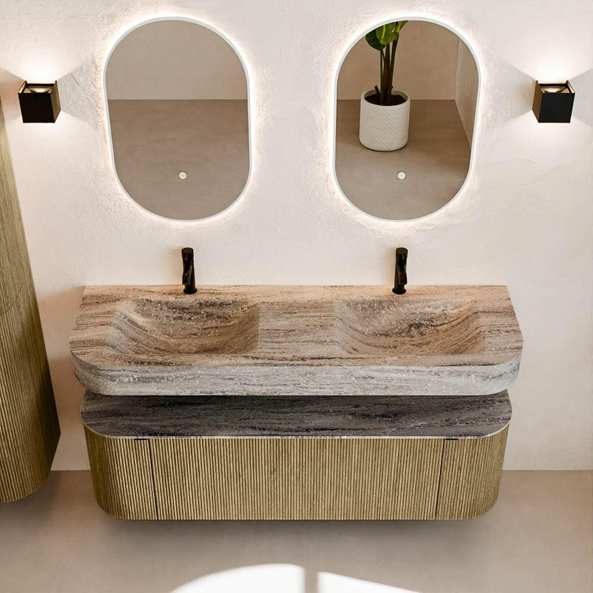 Matériaux naturels dans des tons chauds. Les cannelures verticales apportent rythme et texture au design, tandis que le chêne confère une apparence chaleureuse et artisanale. Choisissez parmi 5 teintes de bois OAK, WALNUT, DUSK, SHADOW et RUBY, des couleurs de bois soigneusement sélectionnées pour enrichir les salles de bains modernes et classiques.