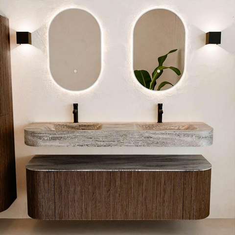Matériaux naturels dans des tons chauds. Les nervures verticales apportent rythme et texture au design, tandis que le chêne confère une apparence chaleureuse et artisanale. Choisissez parmi 5 teintes de bois OAK, WALNUT, DUSK, SHADOW et RUBY, des couleurs de bois soigneusement sélectionnées pour enrichir les salles de bains modernes et classiques.