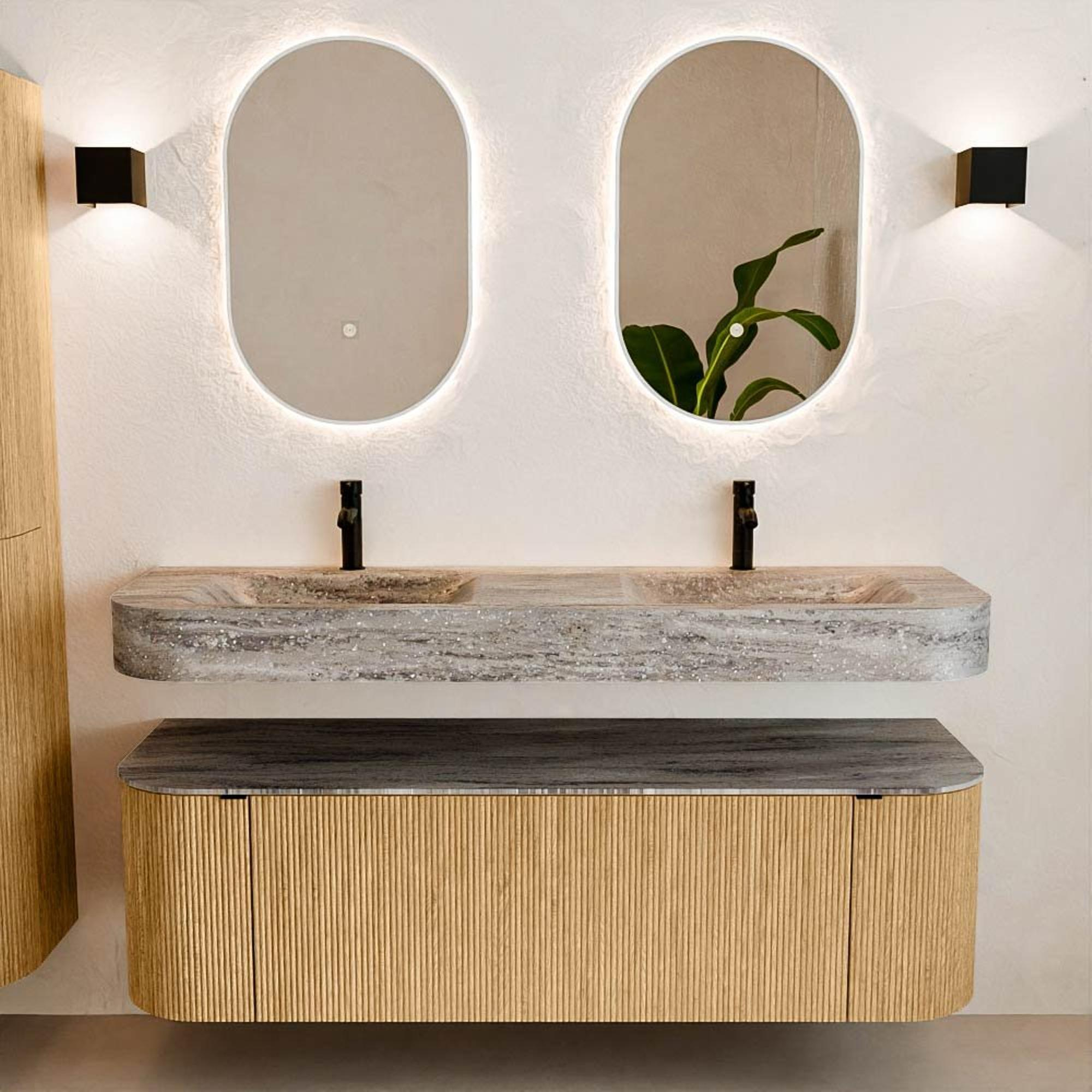 Matériaux naturels dans des tons chauds. Les nervures verticales apportent rythme et texture au design, tandis que le chêne confère une apparence chaleureuse et artisanale. Choisissez parmi 5 teintes de bois OAK, WALNUT, DUSK, SHADOW et RUBY, des couleurs de bois soigneusement sélectionnées pour enrichir les salles de bains modernes et classiques.