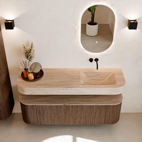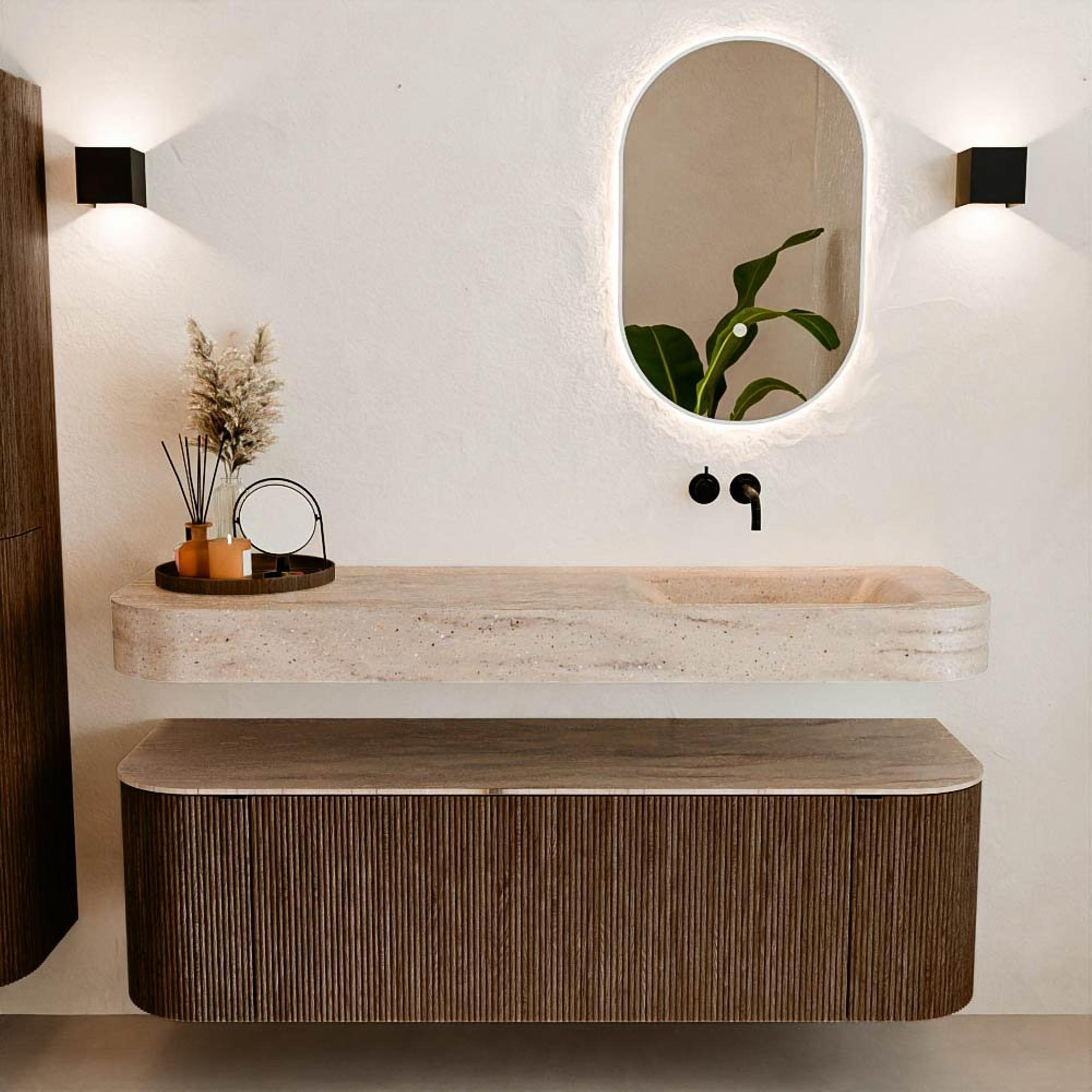 Matériaux naturels dans des tons chauds. Les nervures verticales apportent rythme et texture au design, tandis que le chêne confère une apparence chaleureuse et artisanale. Choisissez parmi 5 teintes de bois OAK, WALNUT, DUSK, SHADOW et RUBY, des couleurs de bois soigneusement sélectionnées pour enrichir les salles de bains modernes et classiques.