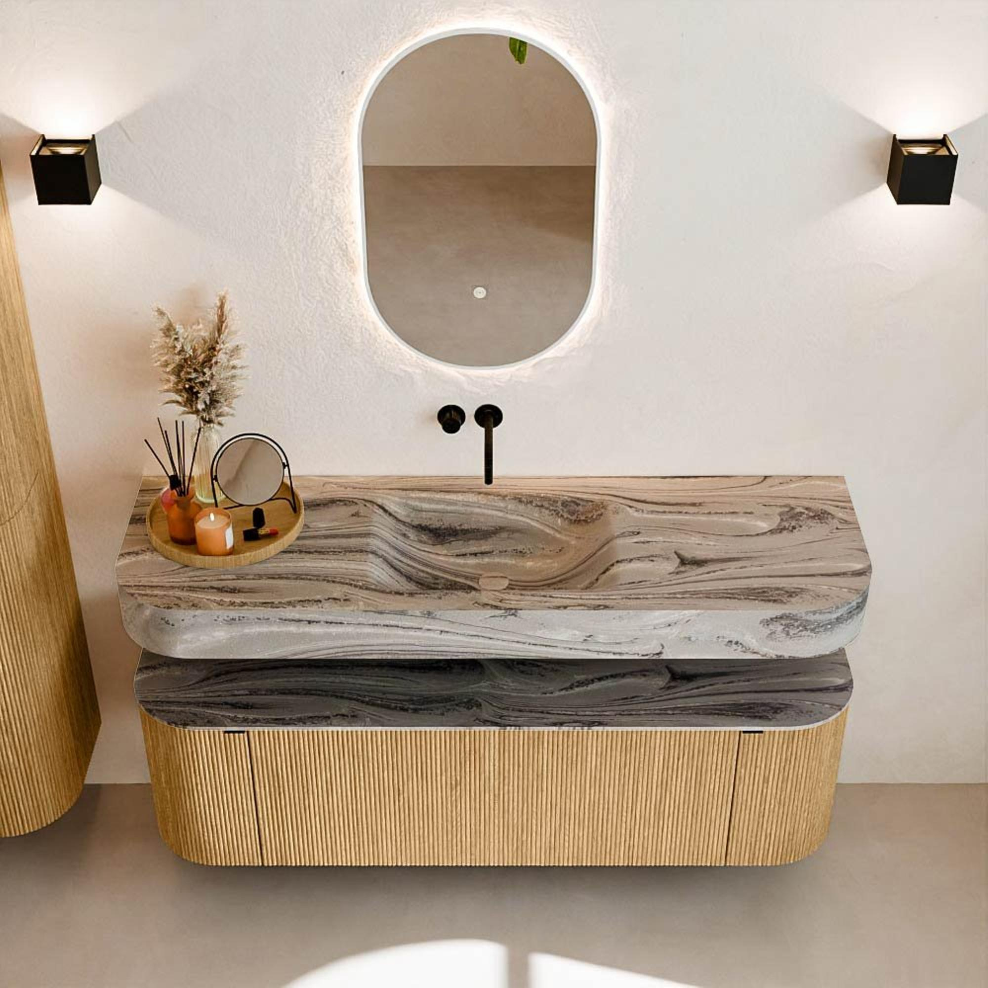 Matériaux naturels aux teintes chaudes. Les cannelures verticales apportent rythme et texture au design, tandis que le chêne confère une apparence chaleureuse et artisanale. Choisissez parmi 5 teintes de bois OAK, WALNUT, DUSK, SHADOW et RUBY, des couleurs de bois soigneusement sélectionnées pour enrichir les salles de bains modernes et classiques.
