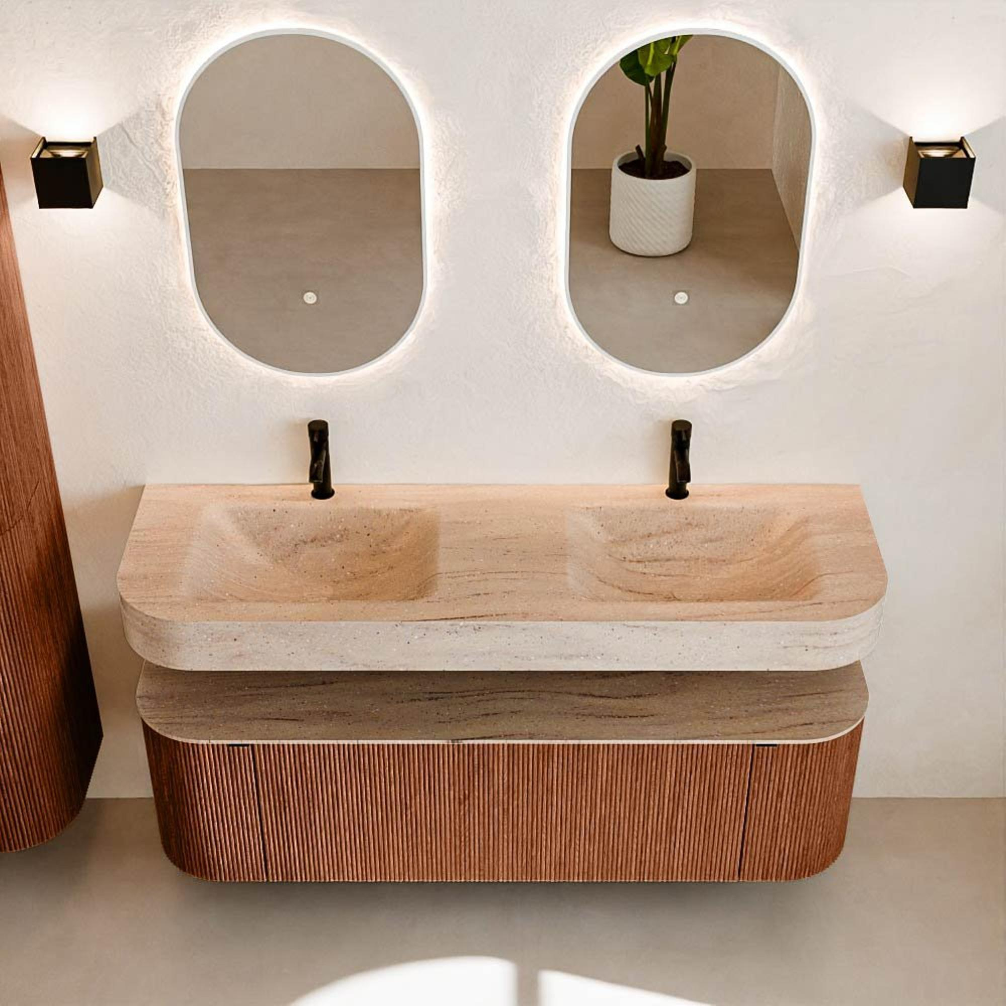 Matériaux naturels dans des tons chauds. Les rainures verticales apportent rythme et texture au design, tandis que le chêne confère une apparence chaleureuse et artisanale. Choisissez parmi 5 teintes de bois OAK, WALNUT, DUSK, SHADOW et RUBY, des couleurs de bois soigneusement sélectionnées pour enrichir les salles de bains modernes et classiques.
