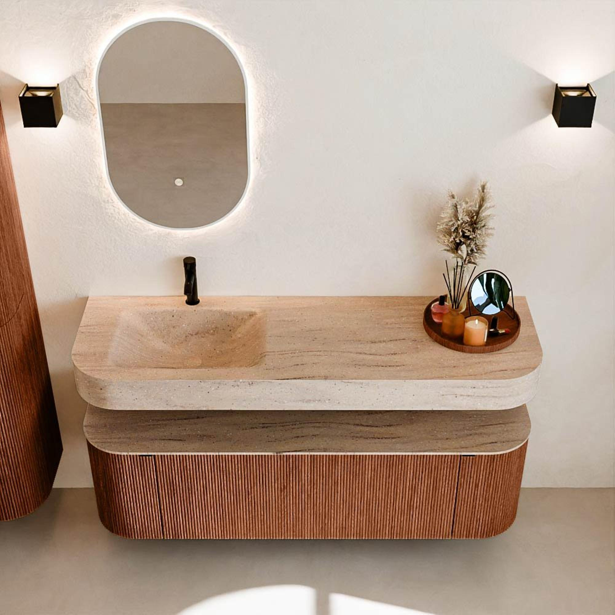 Matériaux naturels dans des tons chauds. Les nervures verticales apportent rythme et texture au design, tandis que le chêne confère une apparence chaleureuse et artisanale. Choisissez parmi 5 teintes de bois OAK, WALNUT, DUSK, SHADOW et RUBY, des couleurs de bois soigneusement sélectionnées pour enrichir les salles de bains modernes et classiques.