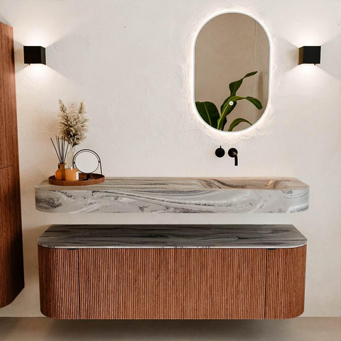 Au-dessus du meuble flotte une vasque suspendue assortie aux coins arrondis – parfaitement adaptée à la forme du meuble. La vasque est réalisée en Solid Surface et suit subtilement les lignes du meuble inférieur, créant ainsi un ensemble harmonieux. Le plan de travail en Solid Surface forme une base solide, facile d'entretien et complète la combinaison.