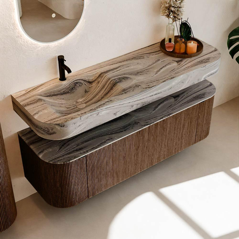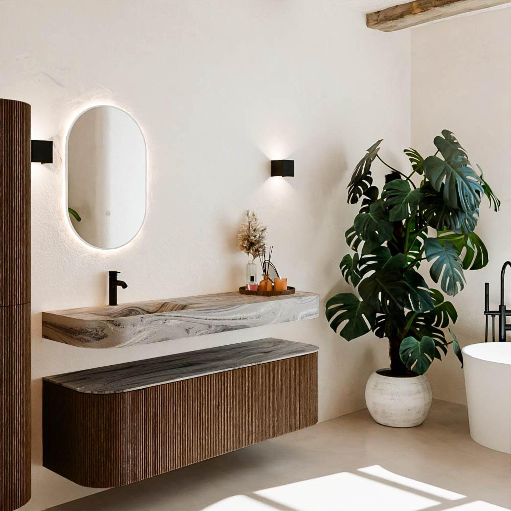 Matériaux naturels dans des tons chauds. Les nervures verticales apportent rythme et texture au design, tandis que le chêne confère une apparence chaleureuse et artisanale. Choisissez parmi 5 teintes de bois OAK, WALNUT, DUSK, SHADOW et RUBY, des couleurs de bois soigneusement sélectionnées pour enrichir les salles de bains modernes et classiques.