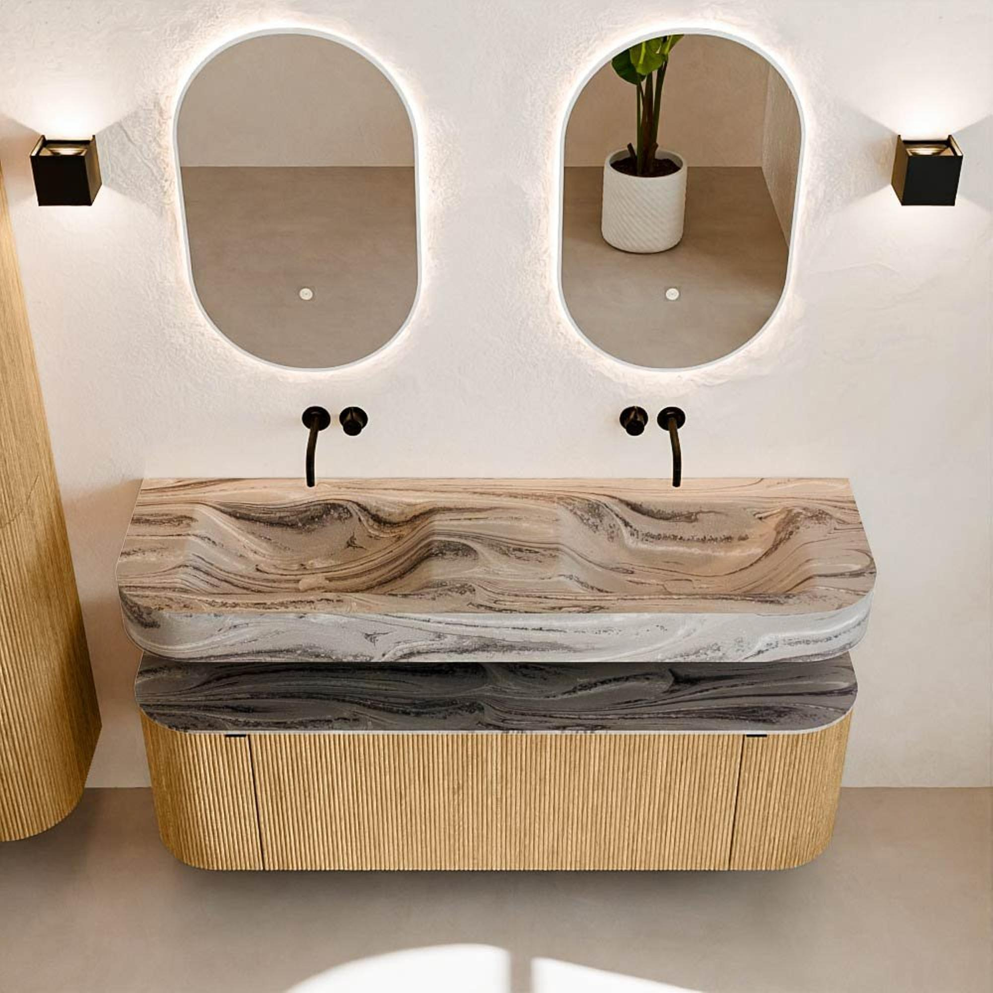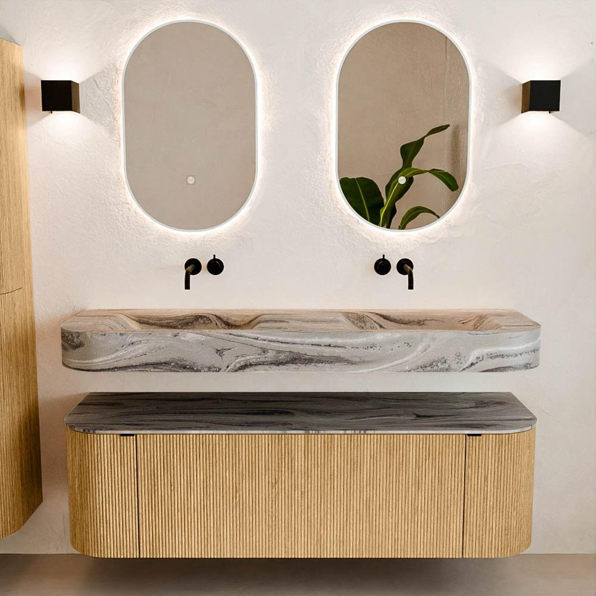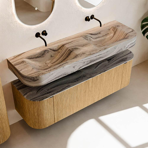 Matériaux naturels aux teintes chaudes. Les cannelures verticales apportent rythme et texture au design, tandis que le chêne confère une apparence chaleureuse et artisanale. Choisissez parmi 5 teintes de bois OAK, WALNUT, DUSK, SHADOW et RUBY, des couleurs de bois soigneusement sélectionnées pour enrichir les salles de bains modernes et classiques.