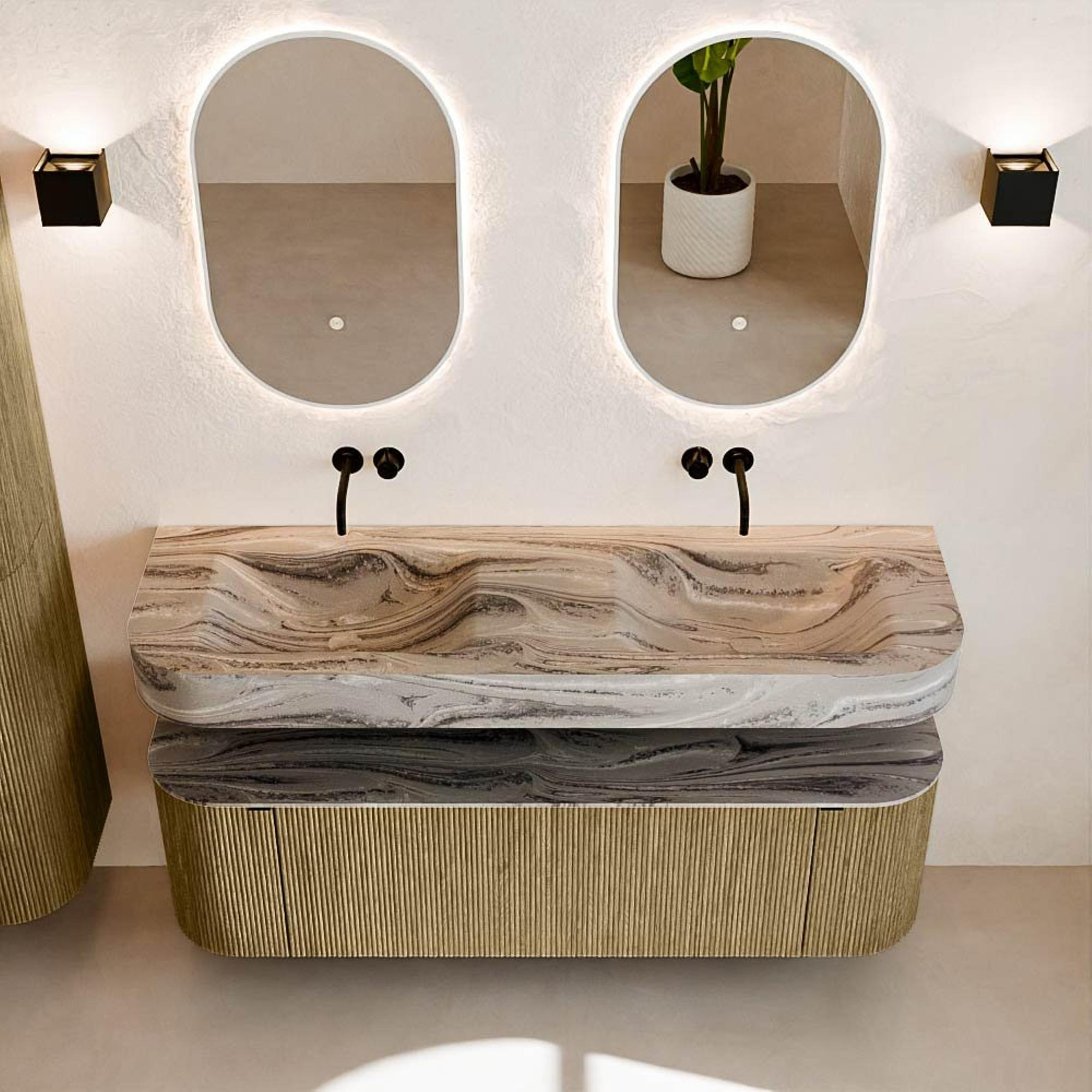 Matériaux naturels dans des tons chauds. Les nervures verticales apportent rythme et texture au design, tandis que le chêne confère une apparence chaleureuse et artisanale. Choisissez parmi 5 teintes de bois OAK, WALNUT, DUSK, SHADOW et RUBY, des couleurs de bois soigneusement sélectionnées pour enrichir les salles de bains modernes et classiques.