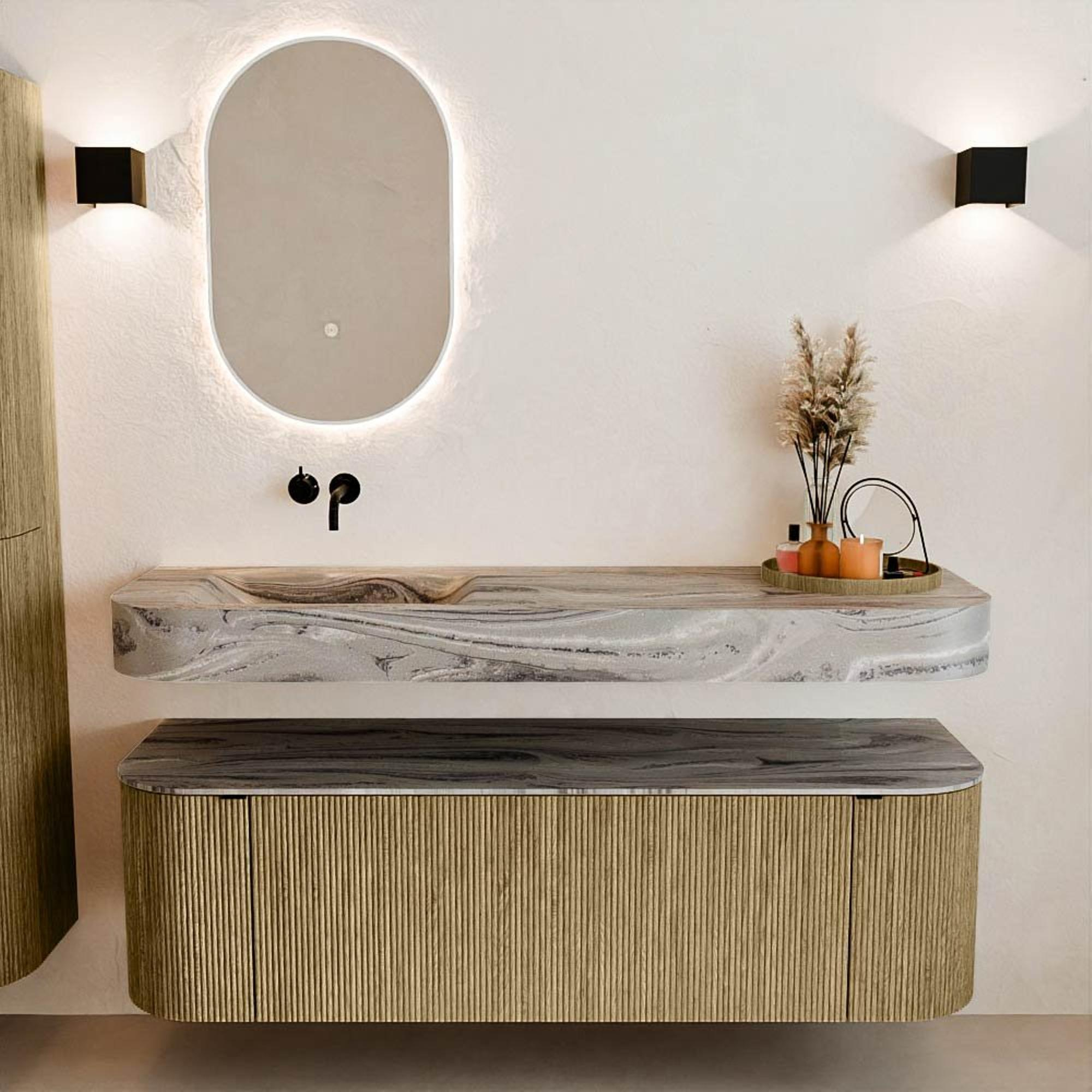 Matériaux naturels dans des tons chauds. Les cannelures verticales apportent rythme et texture au design, tandis que le chêne confère une apparence chaleureuse et artisanale. Choisissez parmi 5 teintes de bois OAK, WALNUT, DUSK, SHADOW et RUBY, des couleurs de bois soigneusement sélectionnées pour enrichir les salles de bains modernes et classiques.