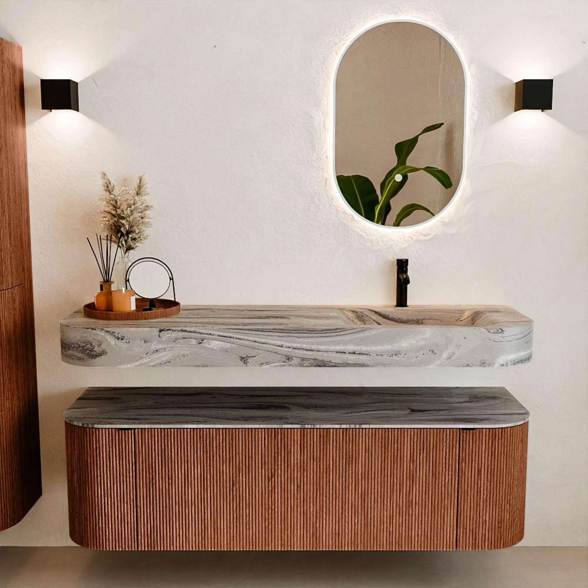 Matériaux naturels dans des tons chauds. Les nervures verticales apportent rythme et texture au design, tandis que le chêne confère une apparence chaleureuse et artisanale. Choisissez parmi 5 teintes de bois OAK, WALNUT, DUSK, SHADOW et RUBY, des couleurs de bois soigneusement sélectionnées pour enrichir les salles de bains modernes et classiques.