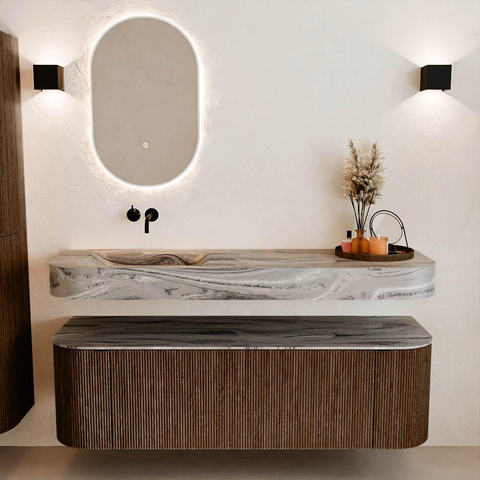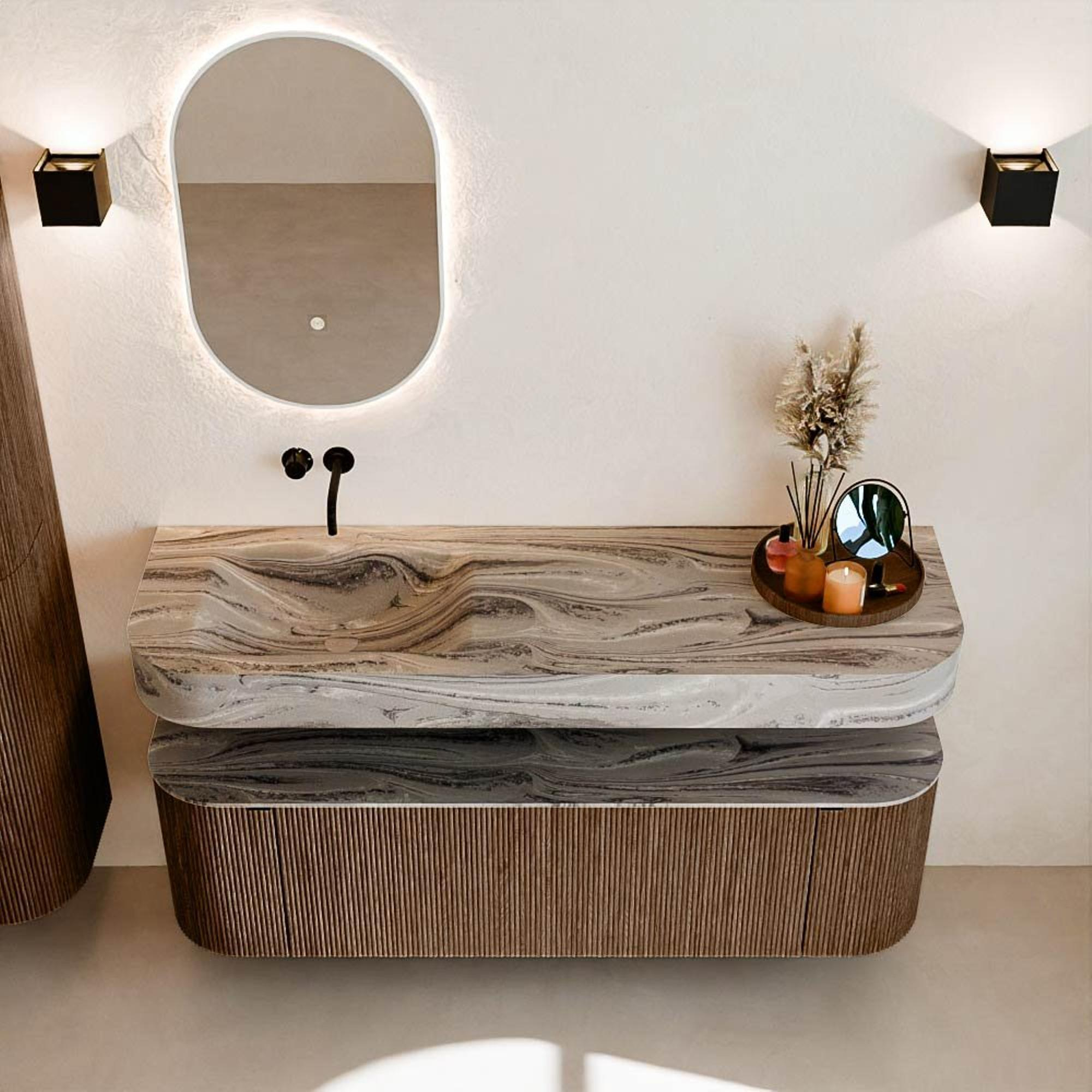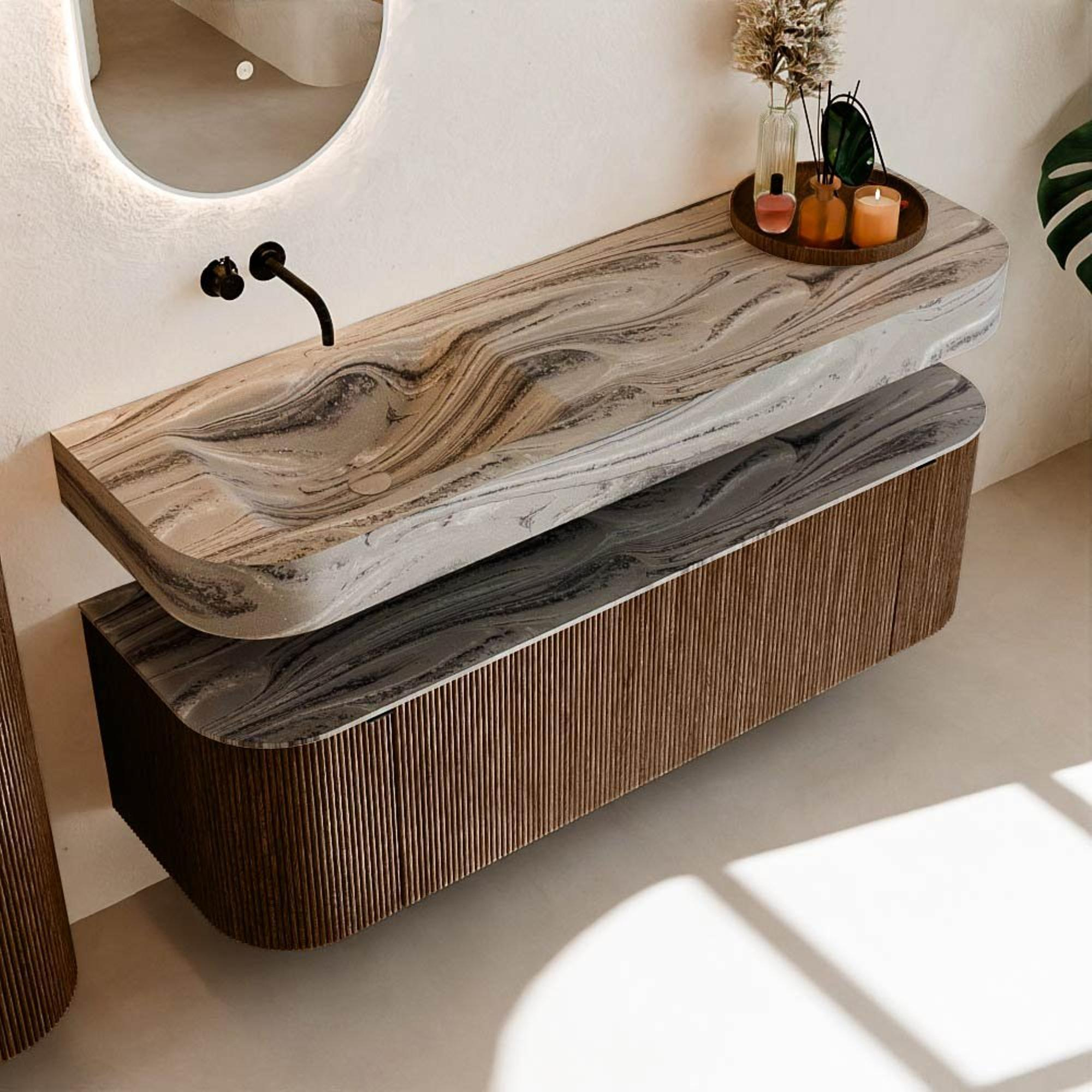 Matériaux naturels aux tons chauds. Les cannelures verticales apportent rythme et texture au design, tandis que le chêne confère une apparence chaleureuse et artisanale. Choisissez parmi 5 teintes de bois OAK, WALNUT, DUSK, SHADOW et RUBY, des couleurs de bois soigneusement sélectionnées pour enrichir les salles de bains modernes et classiques.