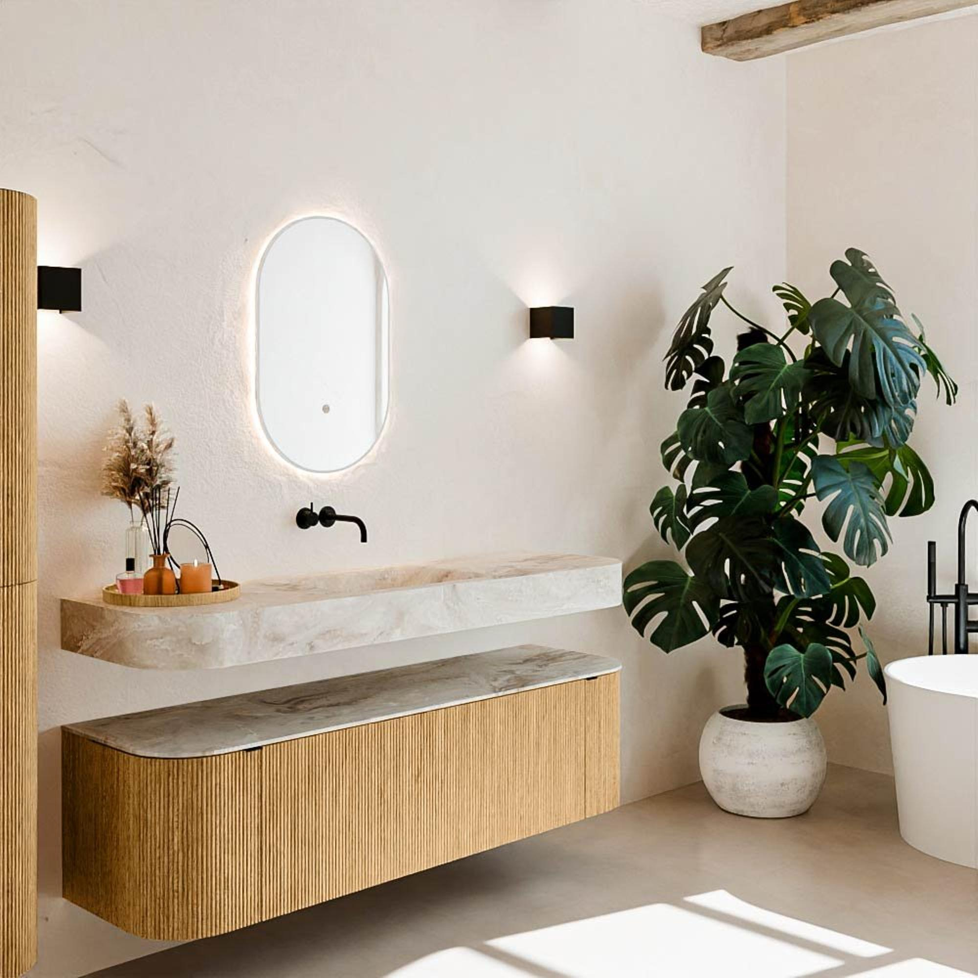Matériaux naturels dans des tons chauds. Les nervures verticales apportent rythme et texture au design, tandis que le chêne confère une apparence chaleureuse et artisanale. Choisissez parmi 5 teintes de bois OAK, WALNUT, DUSK, SHADOW et RUBY, des couleurs de bois soigneusement sélectionnées pour enrichir les salles de bains modernes et classiques.