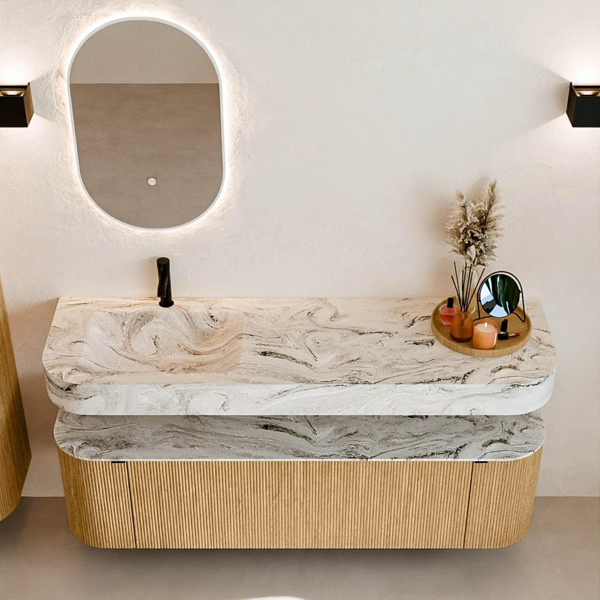 Matériaux naturels dans des tons chauds. Les cannelures verticales apportent rythme et texture au design, tandis que le chêne confère une apparence chaleureuse et artisanale. Choisissez parmi 5 teintes de bois OAK, WALNUT, DUSK, SHADOW et RUBY, des couleurs de bois soigneusement sélectionnées pour enrichir les salles de bains modernes et classiques.