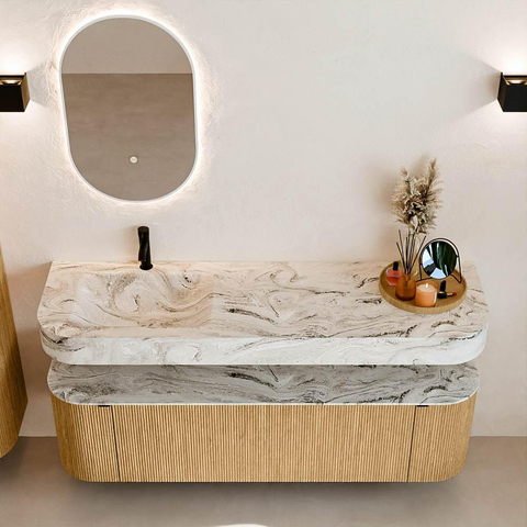 MONDIAZ THOR-DLUX 160cm meuble de salle de bains arrondi gauche + droite couleur Oak avec 1 tiroir et 2 portes. Vasque suspendue CLOUD Gauche 1 trou de robinet couleur Glace.
