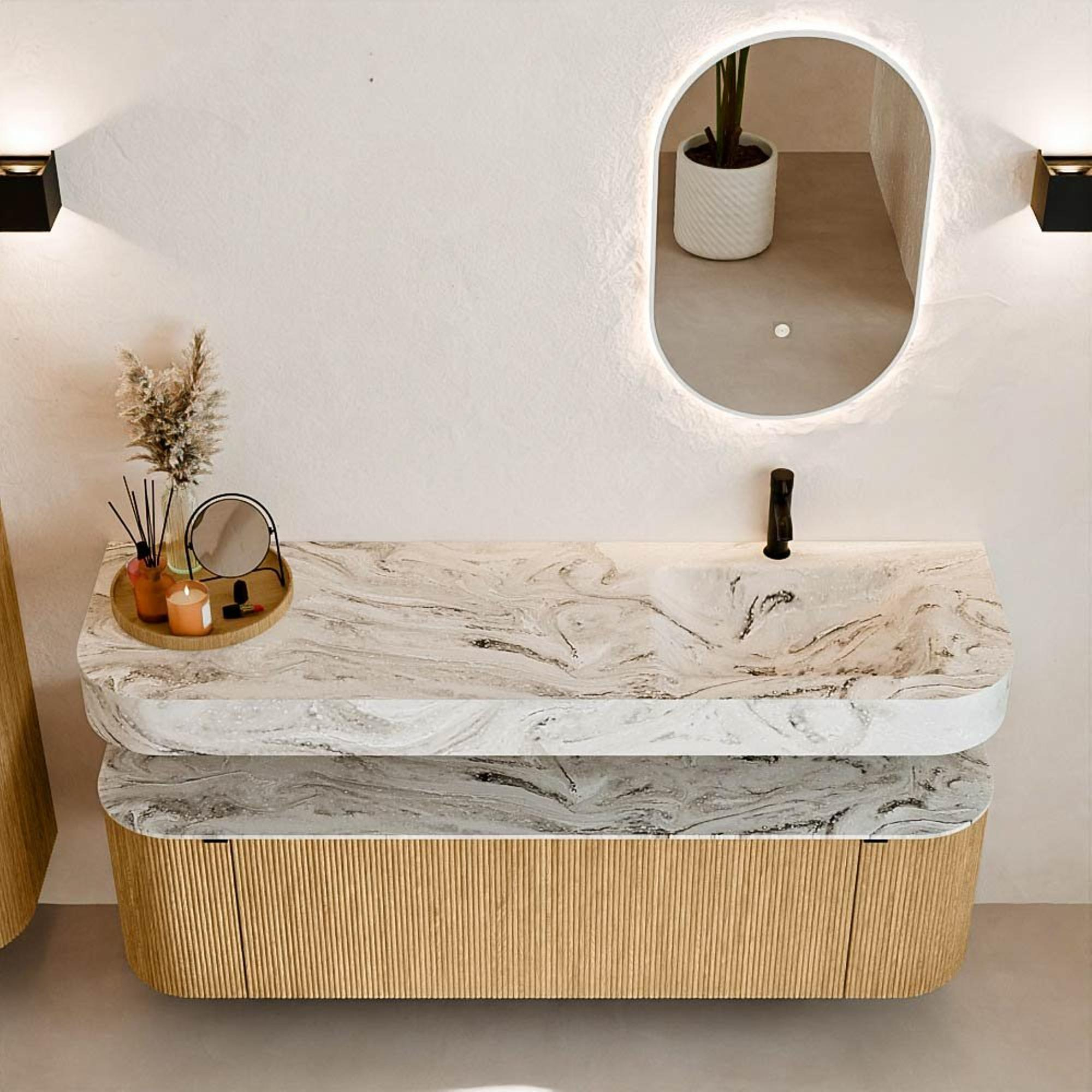 MONDIAZ THOR-DLUX 160cm meuble de salle de bains arrondi gauche + droite couleur Oak avec 1 tiroir et 2 portes. Vasque suspendue CLOUD Droite 1 trou de robinet couleur Glace.
