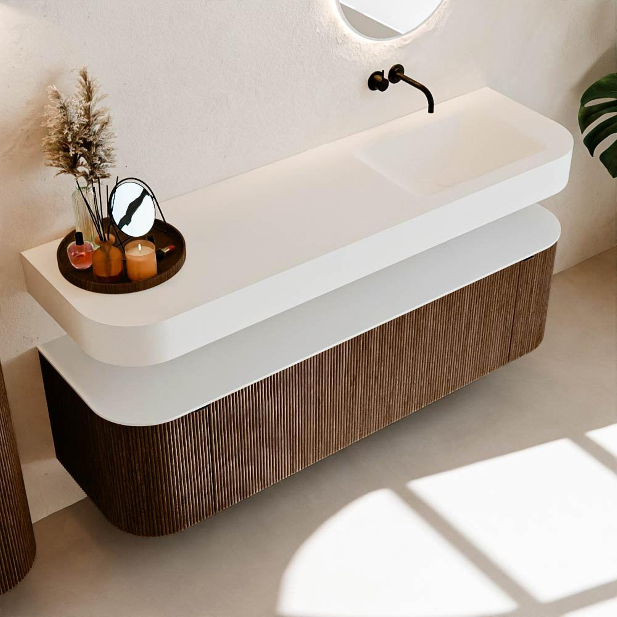 Au-dessus du meuble flotte une vasque suspendue assortie aux coins arrondis – parfaitement adaptée à la forme du meuble. La vasque est réalisée en Solid Surface et suit subtilement les lignes du meuble sous-jacent, créant ainsi un ensemble harmonieux. Le plan de travail en Solid Surface forme une base solide et facile d'entretien et complète la combinaison.
