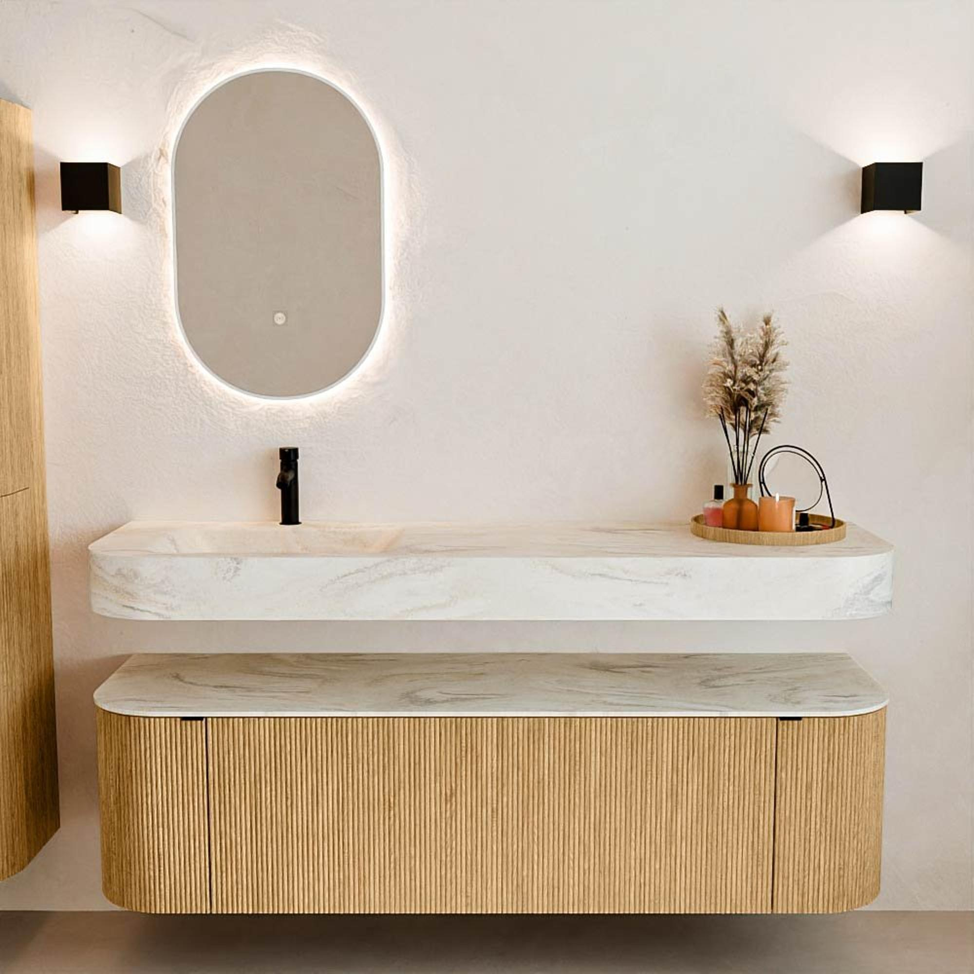 Au-dessus du meuble flotte une vasque suspendue assortie aux coins arrondis – parfaitement adaptée à la forme du meuble. La vasque est réalisée en Solid Surface et suit subtilement les lignes du meuble inférieur, créant ainsi un ensemble harmonieux. Le plan de travail en Solid Surface forme une base solide, facile d'entretien, et complète la combinaison.