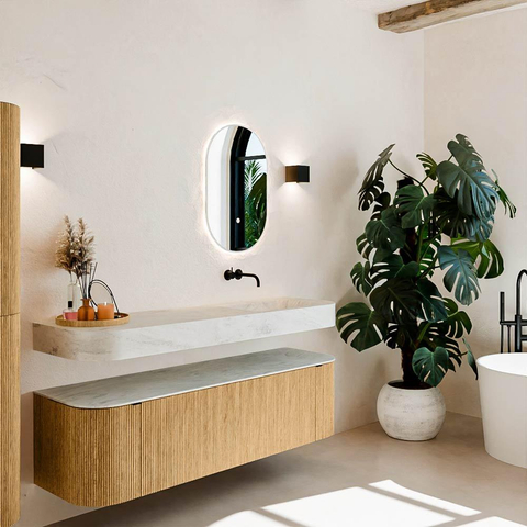 Matériaux naturels dans des tons chauds. Les nervures verticales apportent rythme et texture au design, tandis que le chêne confère une apparence chaleureuse et artisanale. Choisissez parmi 5 teintes de bois OAK, WALNUT, DUSK, SHADOW et RUBY, des couleurs de bois soigneusement sélectionnées pour enrichir les salles de bains modernes et classiques.