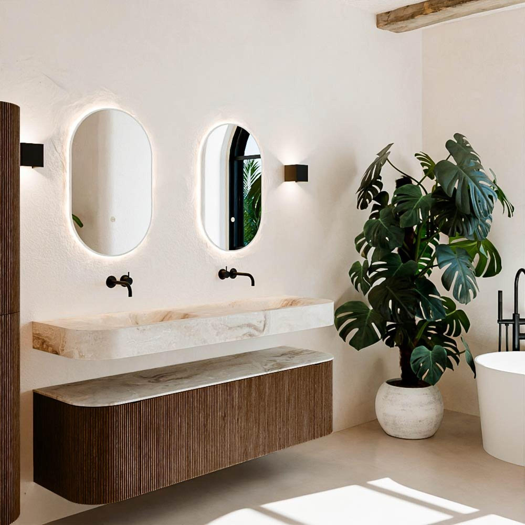 Matériaux naturels dans des tons chauds. Les reliefs verticaux apportent rythme et texture au design, tandis que le chêne confère une apparence chaleureuse et artisanale. Choisissez parmi 5 teintes de bois OAK, WALNUT, DUSK, SHADOW et RUBY, des couleurs de bois soigneusement sélectionnées pour enrichir les salles de bains modernes et classiques.