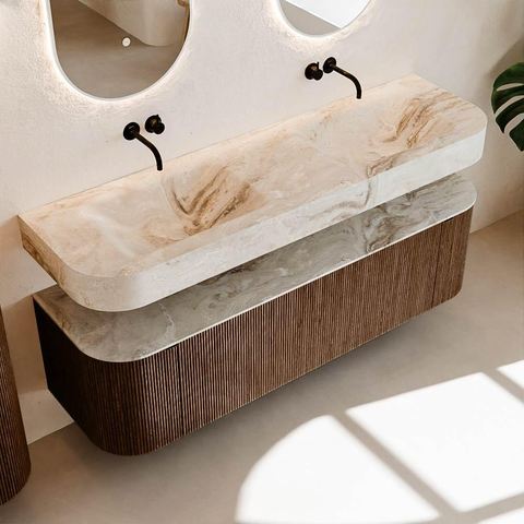 MONDIAZ THOR-DLUX 160cm meuble de salle de bains arrondi gauche + droite couleur Walnut avec 1 tiroir et 2 portes. Vasque suspendue CLOUD Double sans trou de robinet couleur Frappe.