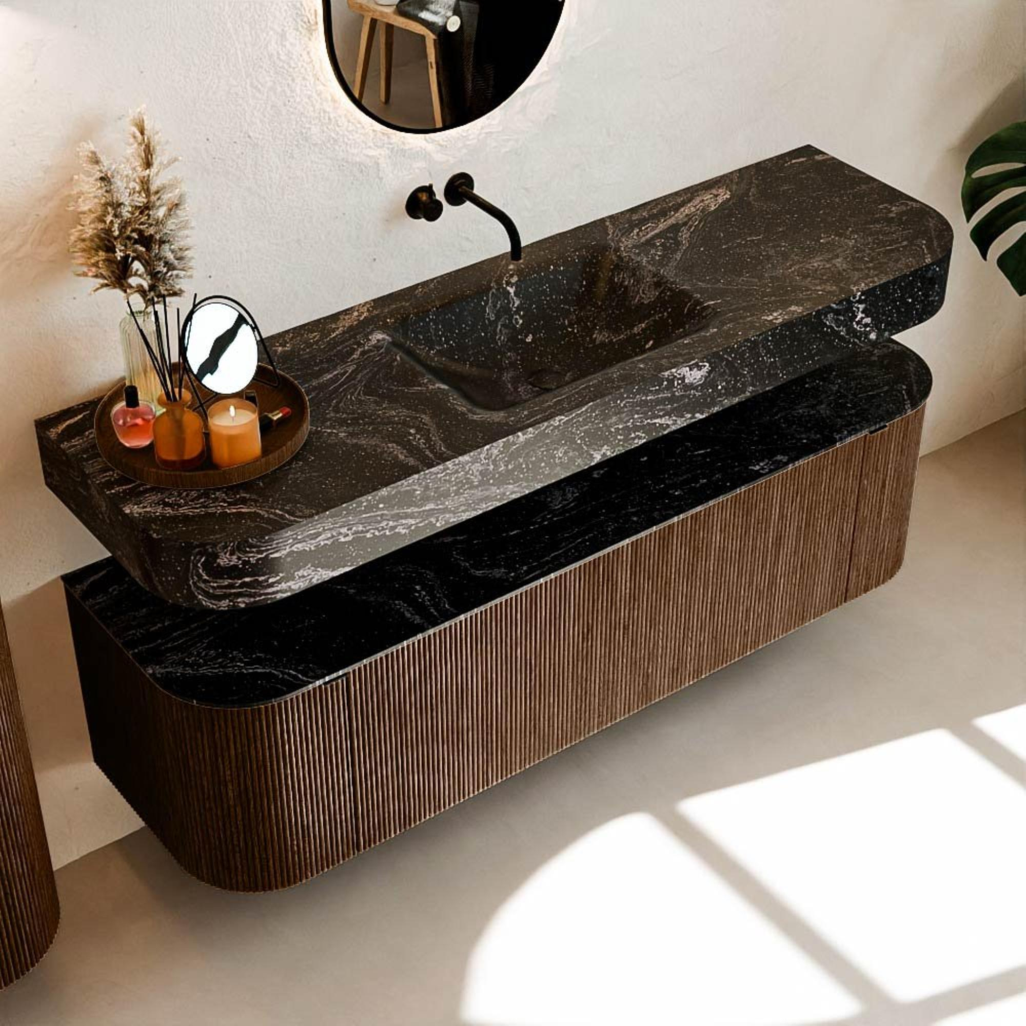 Matériaux naturels dans des tons chauds. Les nervures verticales apportent rythme et texture au design, tandis que le chêne confère une apparence chaleureuse et artisanale. Choisissez parmi 5 teintes de bois OAK, WALNUT, DUSK, SHADOW et RUBY, des couleurs de bois soigneusement sélectionnées pour enrichir les salles de bains modernes et classiques.